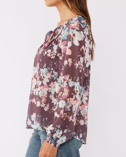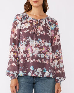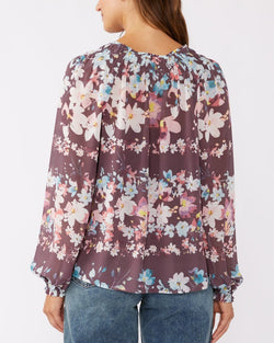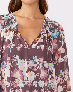 This elegant long-sleeve top features a smocked split V-neckline with a charming spaghetti tie and a hook and eye closure. Crafted from whimsical floral pebble chiffon, it boasts ruffle elastic cuffs for a playful touch and a detachable lining for versatility. Perfect for any occasion, this blouse is sure to stand out.