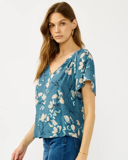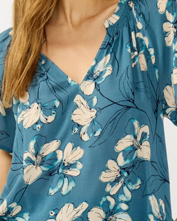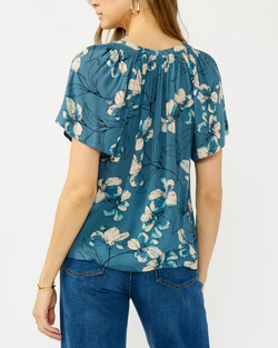 Designed for fall in a rich teal floral print, this short sleeve top is made from airy rayon voile crepe with a soft drape and breathable feel. It features a clean finished neck band with a split neckline, delicate shirring around the front and back for subtle volume, and short sleeves with a relaxed fit. The bodice flows effortlessly into a clean finished hem, offering comfort and movement with a feminine touch.