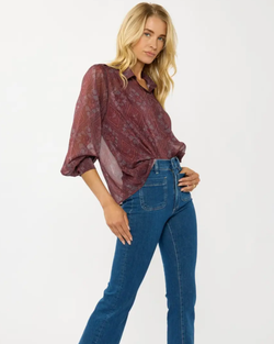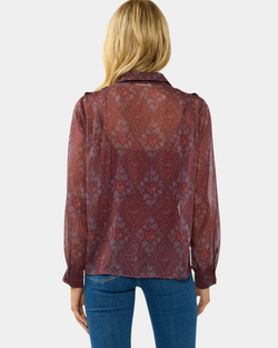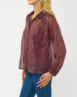 This sheer button-down blouse shines with a diamond floral print on lurex chiffon stripes and crisp, clean finishes. Featuring playful shoulder tap details and delicate shell buttons, it drapes softly for a light, elevated style.