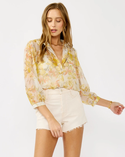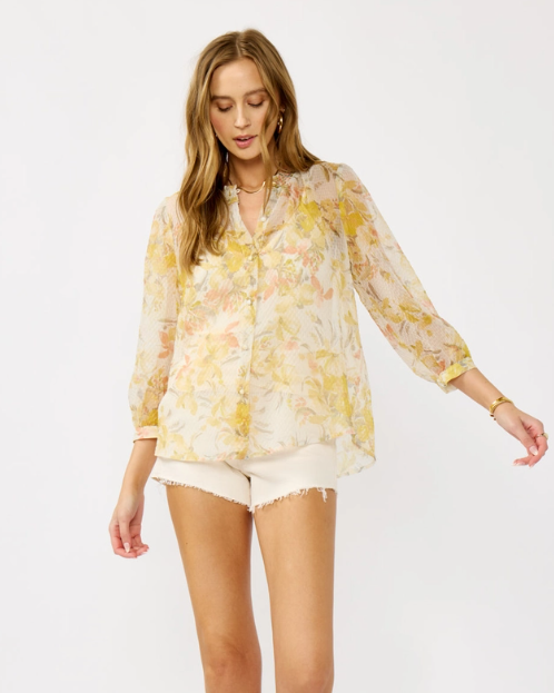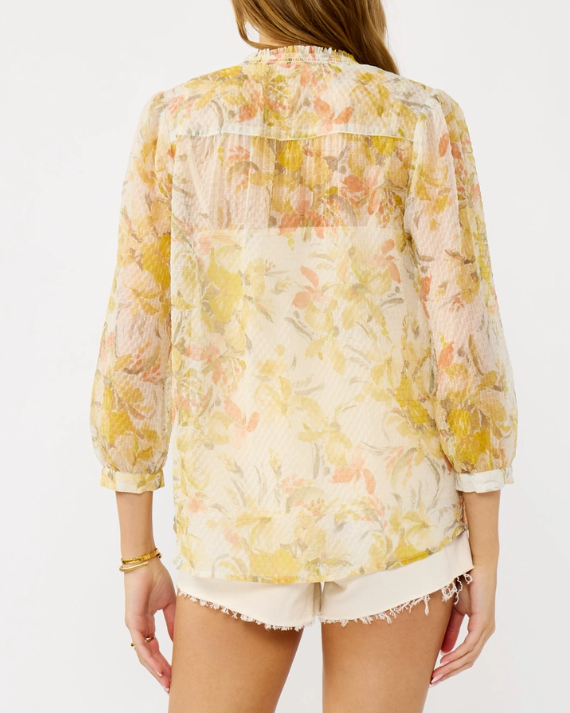 Effortlessly feminine, this textured sheer chiffon floral blouse with a square pattern combines a smocked neckline with a button-down front for a flattering, tailored fit. The 3/4 sleeves, button cuffs, and curved bottom hemline add thoughtful details, making it a perfect blend of comfort and style for casual or dressier summer occasions.