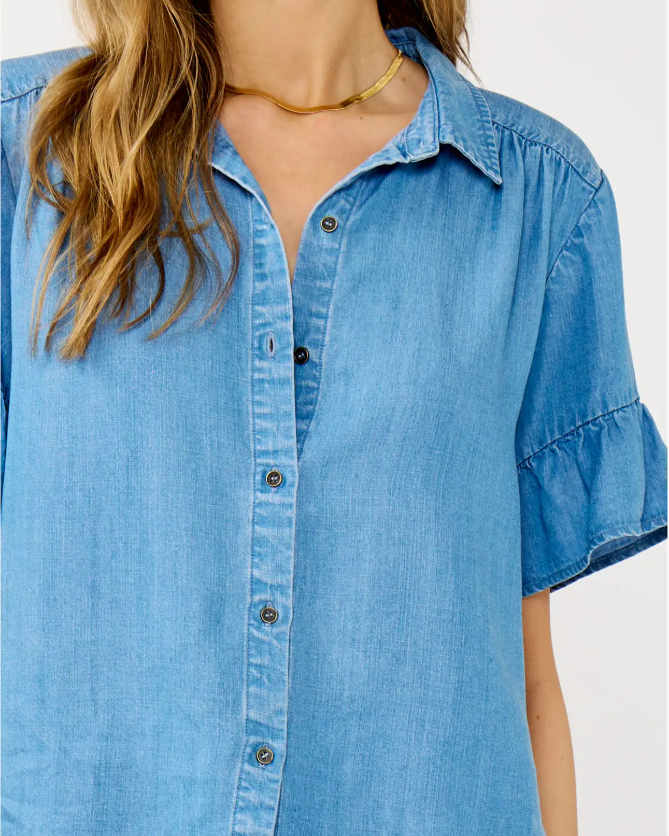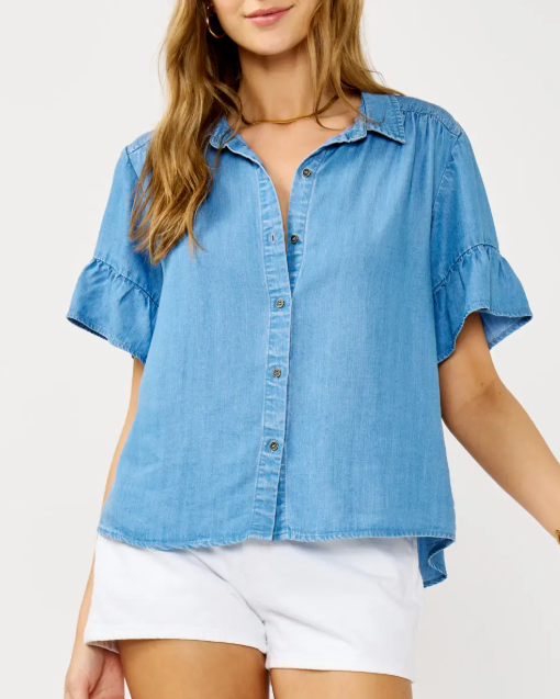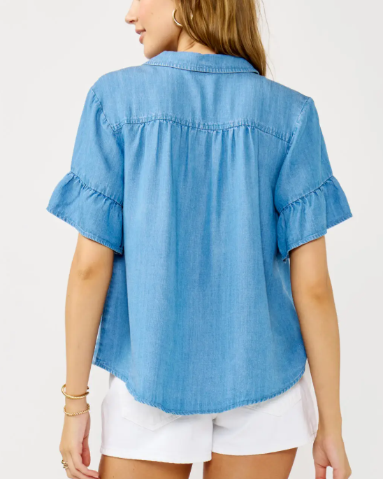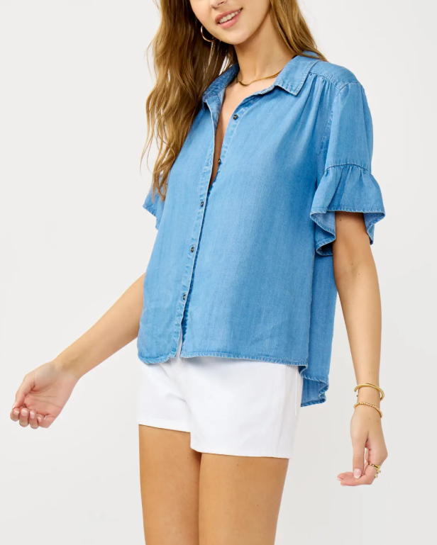 Crafted from light wash Tencel, this button-down top features a collared neckline with a high-low hem for a relaxed yet polished look. The front and back yokes, shirred ruffle sleeves with seams, and a five-button closure create a beautifully tailored silhouette with a feminine touch, perfect for warmer days.