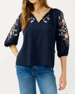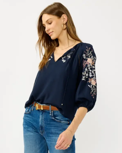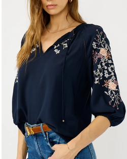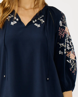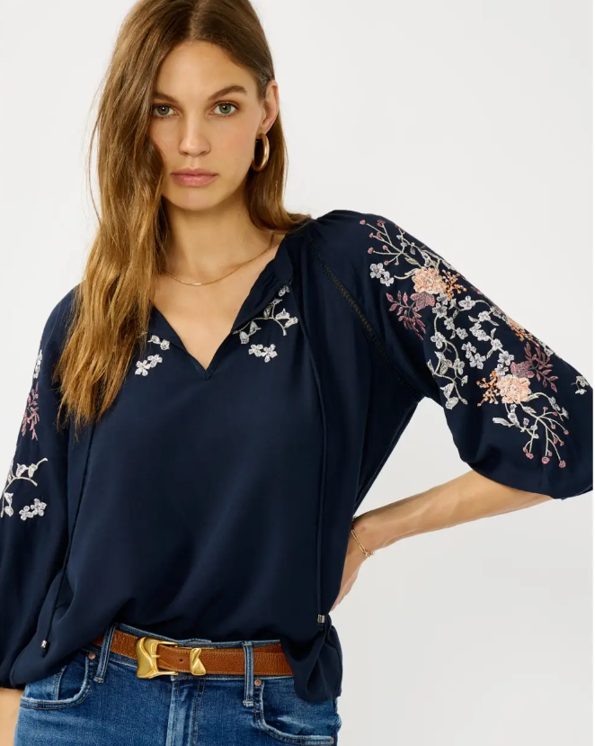 Designed with effortless elegance, this flowy long sleeve blouse features soft rayon challis fabric and a delicate split neckline with self ties. Floral embroidery graces the center front and sleeves, while ladder trim, elasticated cuffs, and a clean turn-back hemline add refined detail, making it the perfect blend of romantic charm and fall-ready comfort.