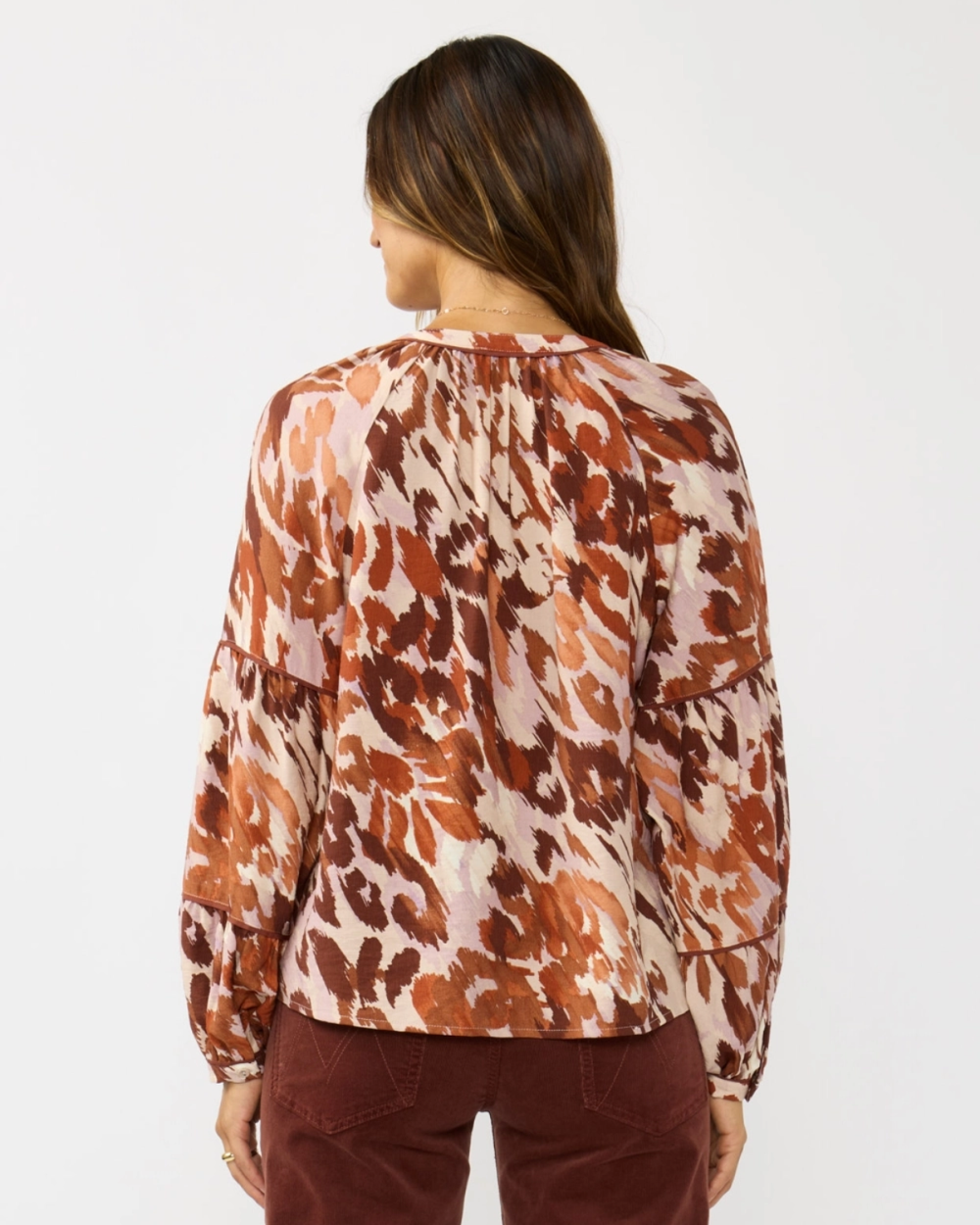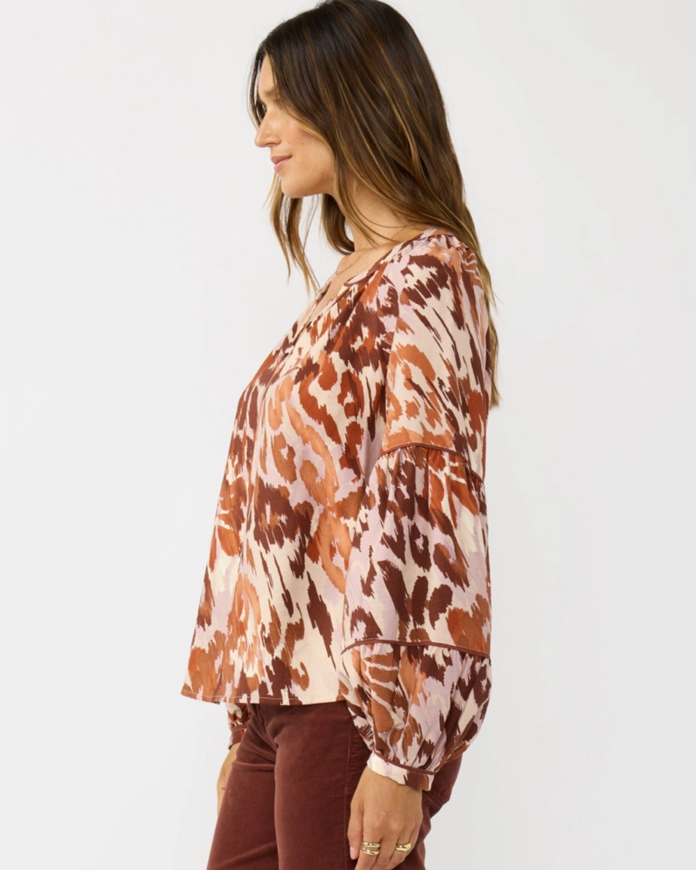 Lightweight rayon crinkle gauze blouse with a bold abstract print and refined piping details. Perfect for fall layering with effortless style.