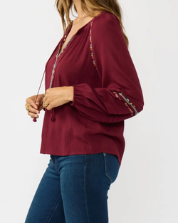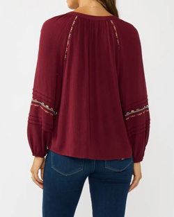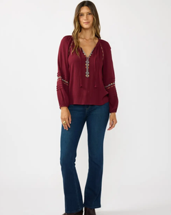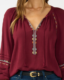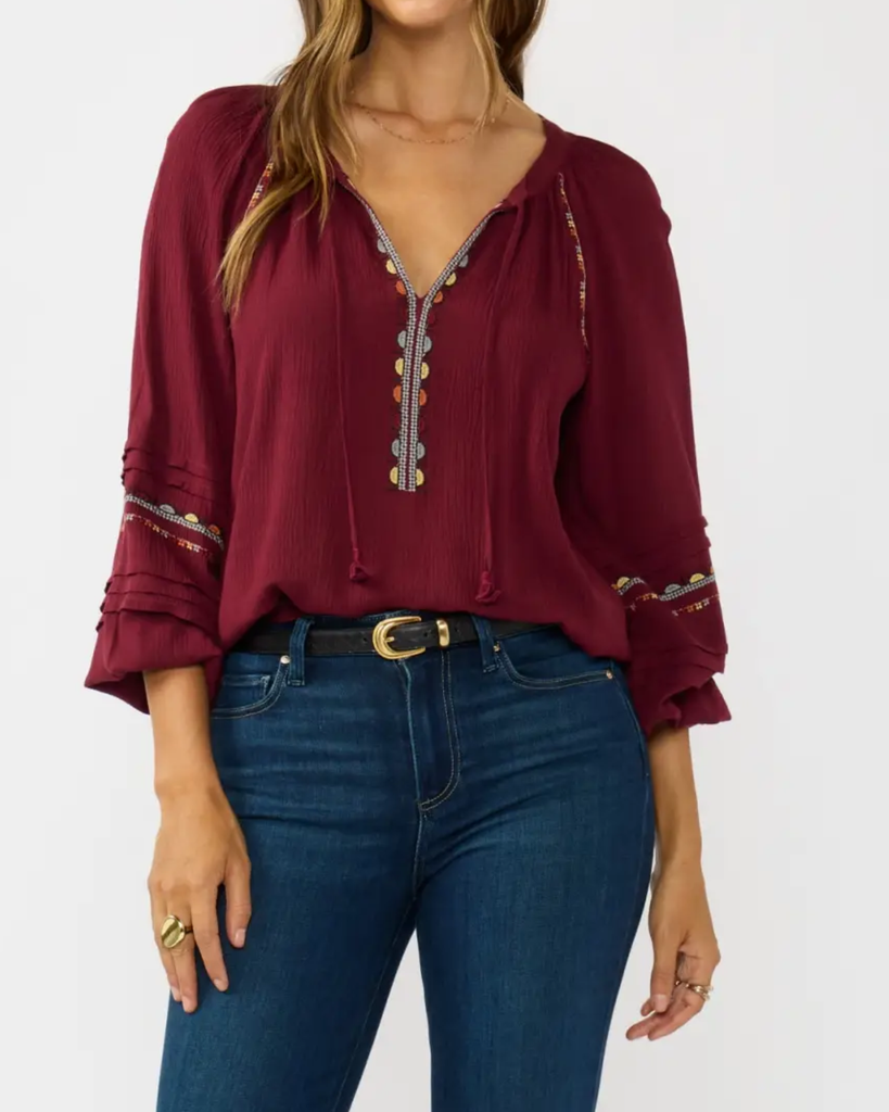 This cozy fall blouse is made from soft rayon slub and features a playful split neckline with delicate self drawstrings and petal tassels. The long raglan sleeves show off fun embroidered details above the cuffs, with subtle pleats and elasticated hems for a comfy, chic fit.