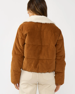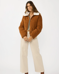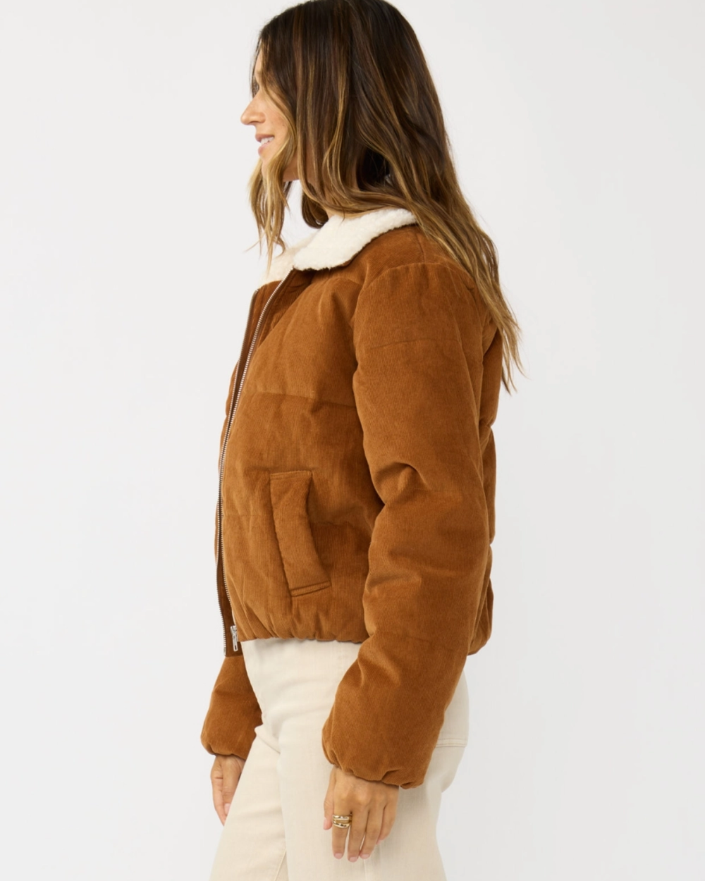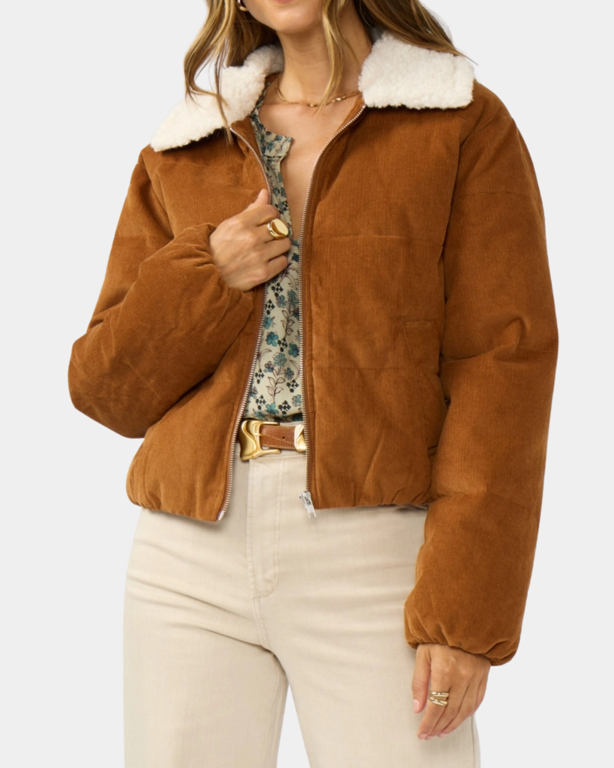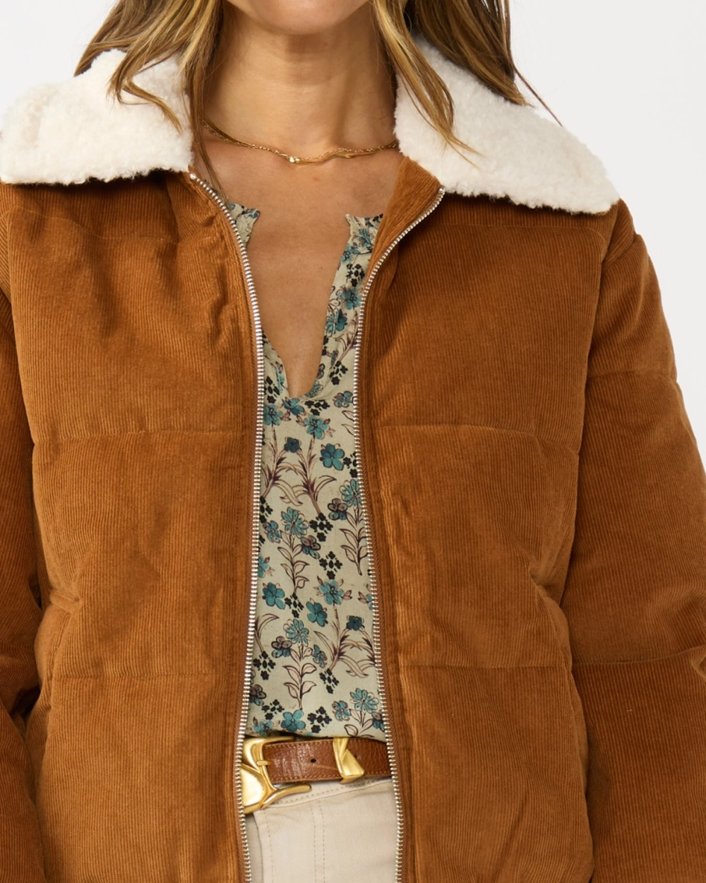 This camel corduroy puffer marries comfort with refined style. The sumptuous sherpa collar provides exceptional warmth, while the tailored silhouette and impeccable finishing details ensure a polished appearance. An essential layering piece for the discerning autumn wardrobe.