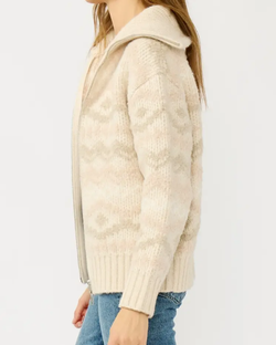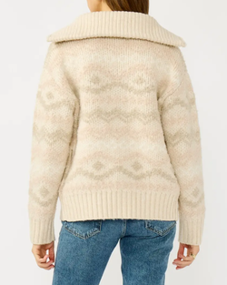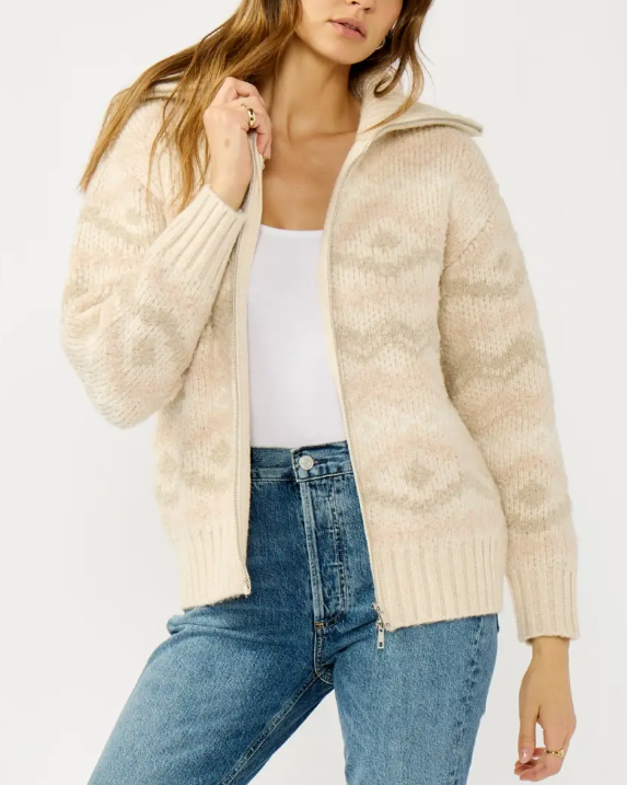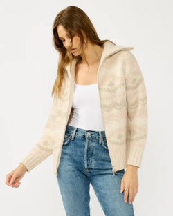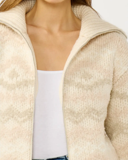 This cozy fair isle front zip sweater features a classic ribbed collar with double layer construction and long sleeves that showcase the traditional Nordic inspired geometric pattern in soft neutral tones. The full front zipper extends from the ribbed neckband to the bottom hem, complemented by practical side pockets and finished with a comfortable ribbed hem that hits perfectly at the hip for a timeless, versatile layering piece.