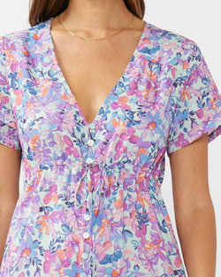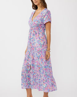 Elevate your spring wardrobe with the V-Neck Button-Down Maxi Dress, designed for effortless elegance. Made from breathable floral cotton voile, this dress features a flattering empire waist and a functional button-down front with elastic loops and buttons. The short sleeves and lined bodice offer comfort, while the adjustable self-tie waist ensures a customizable fit. A ruffle-trimmed tiered skirt flows beautifully, creating a graceful silhouette perfect for warm-weather occasions.