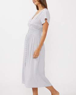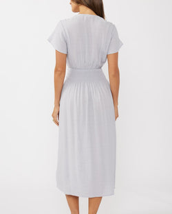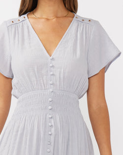 This solid-color short sleeve V-neck button-down midi dress features a smocked waist and front slit, combining comfort and style. The crinkled texture adds depth, while the flutter sleeves and flowing design create a relaxed, feminine look. Delicate gold button accents on the shoulder complete the dress, making it the perfect choice for a chic spring outfit.