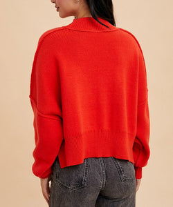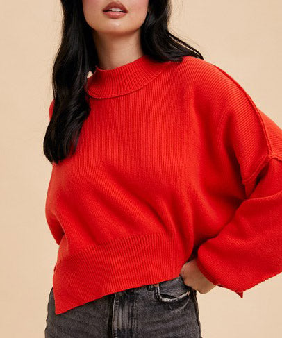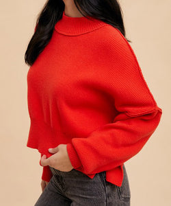This daring sweater features a mock neckline, rib band detailing and drop sleeves. Done in the perfect cherry red shade, this sweater is so cute styled with everything from jeans to leggings to skirts and everything in between.