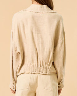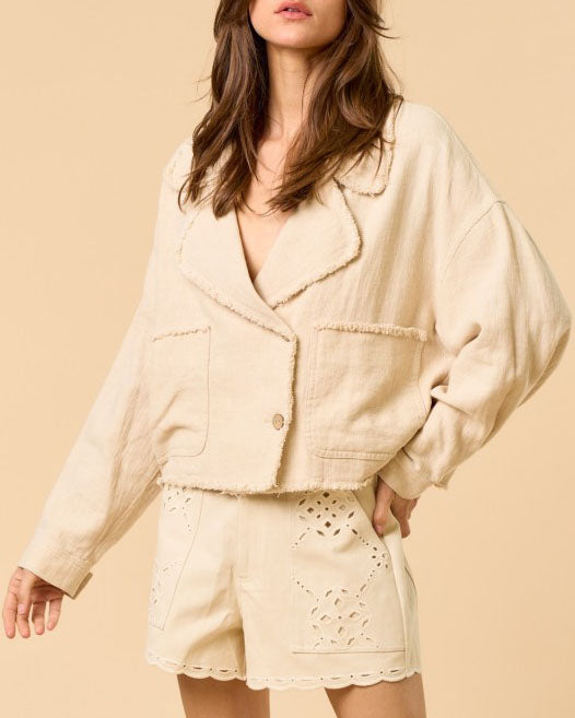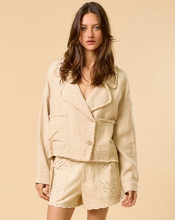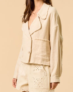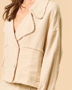 This darling linen jacket features a collared neckline, button closure, a raw hem and side pockets. The perfect layering piece to throw over casual outfits. A must for everyday wear.
