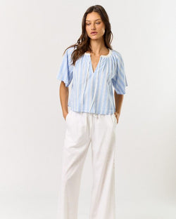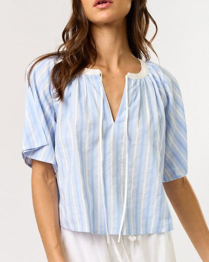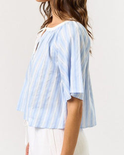 This stripe short sleeve top is the perfect addition to your warm weather wardrobe. With its loose fit and lightweight fabric, it offers a relaxed feel. The on trend stripe patter adds a touch of chic, while the front tie detail gives it a playful an stylish twist.