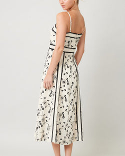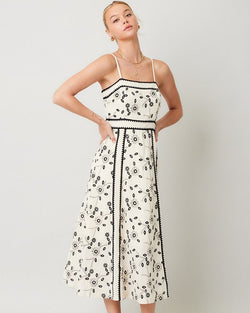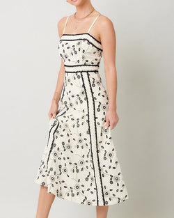 This gorgeous midi dress features an embroidered fabrication, a sleeveless silhouette, lace dress and adjustable straps. Easy to dress up or down, this dress can be styled with everything from sandals to heels to boots.