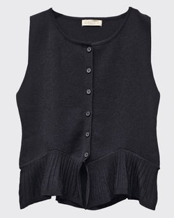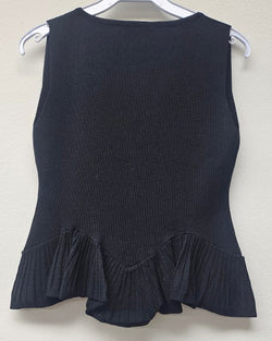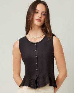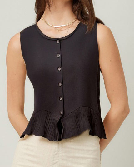 This soft knit fabric cardigan tank features a button front, round neckline and a ruffled hem. A wardrobe staple that can be styled with everything from skirts, jeans, or pants.