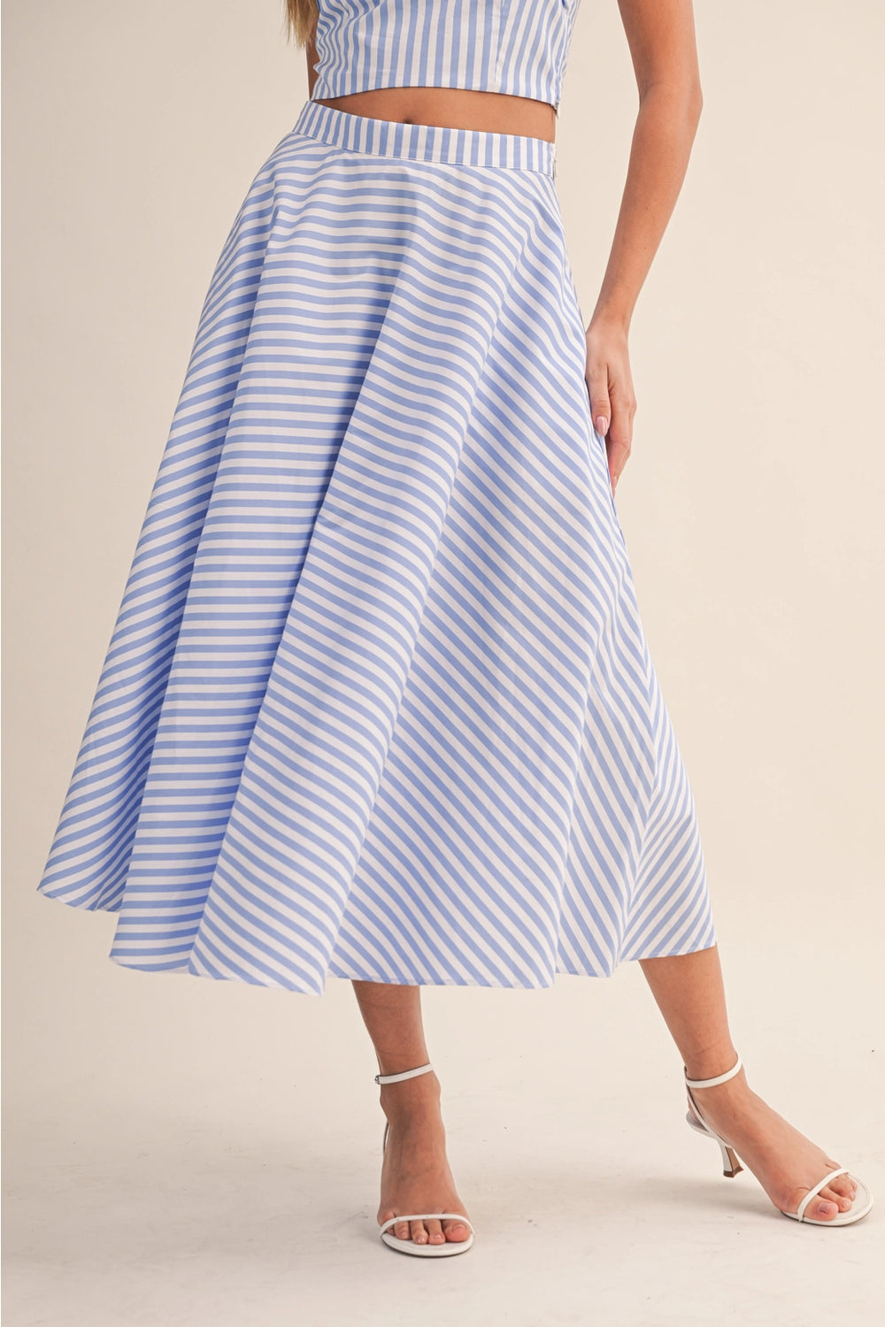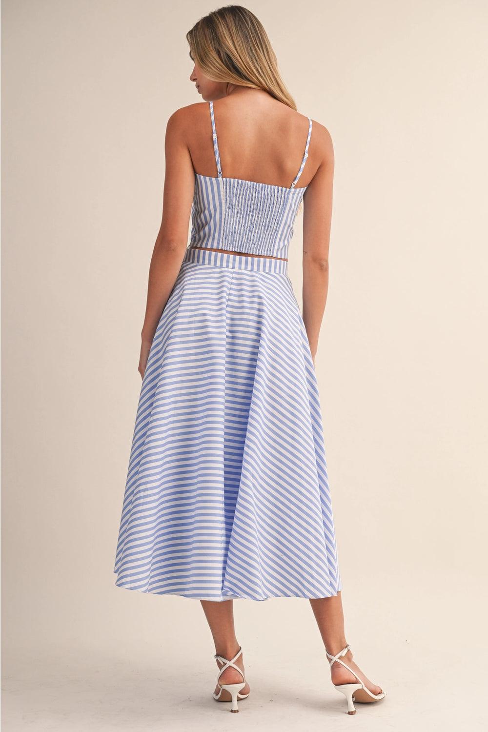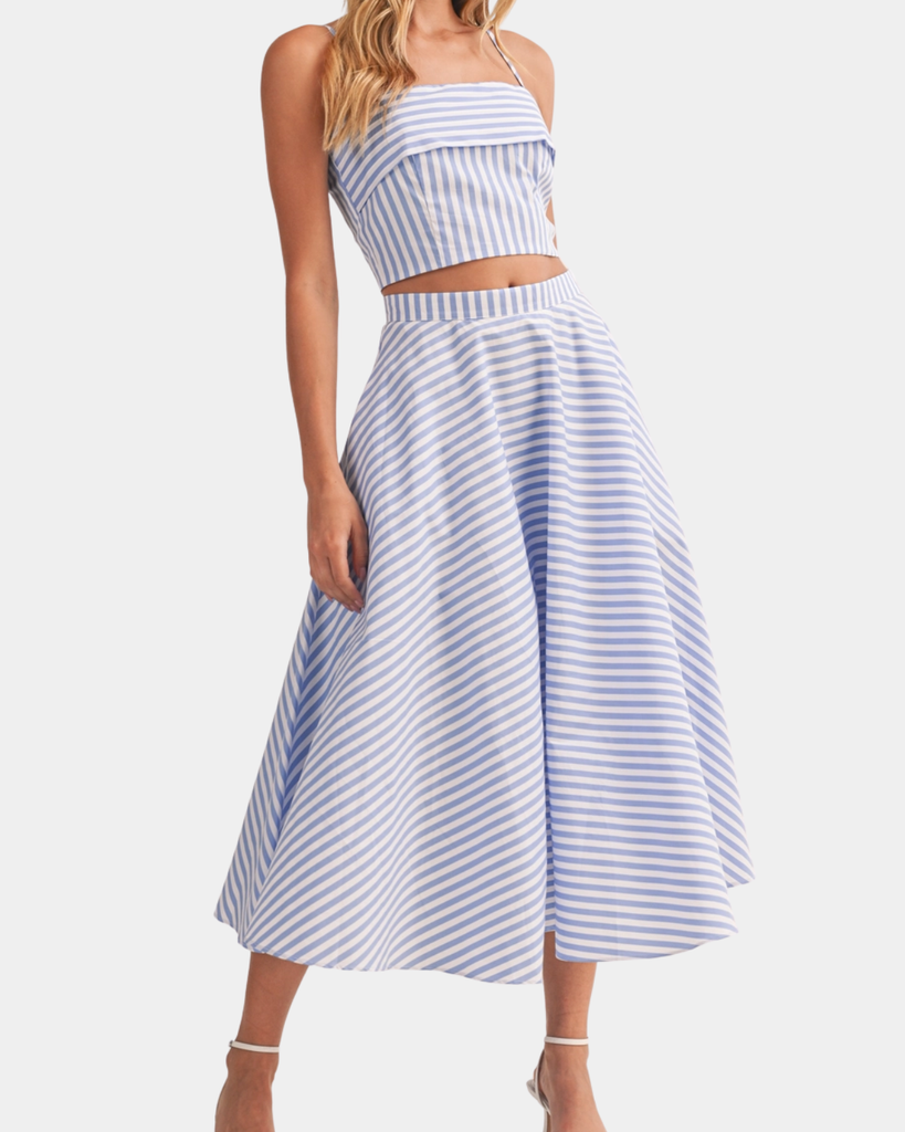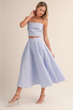 Cute and casual never looked so good! This charming two-piece set pairs a striped cropped top with a flowy A-line midi skirt in soft chambray. Perfect for effortless style that takes you from brunch to evening plans. Mix, match, or wear together—either way, you'll turn heads.