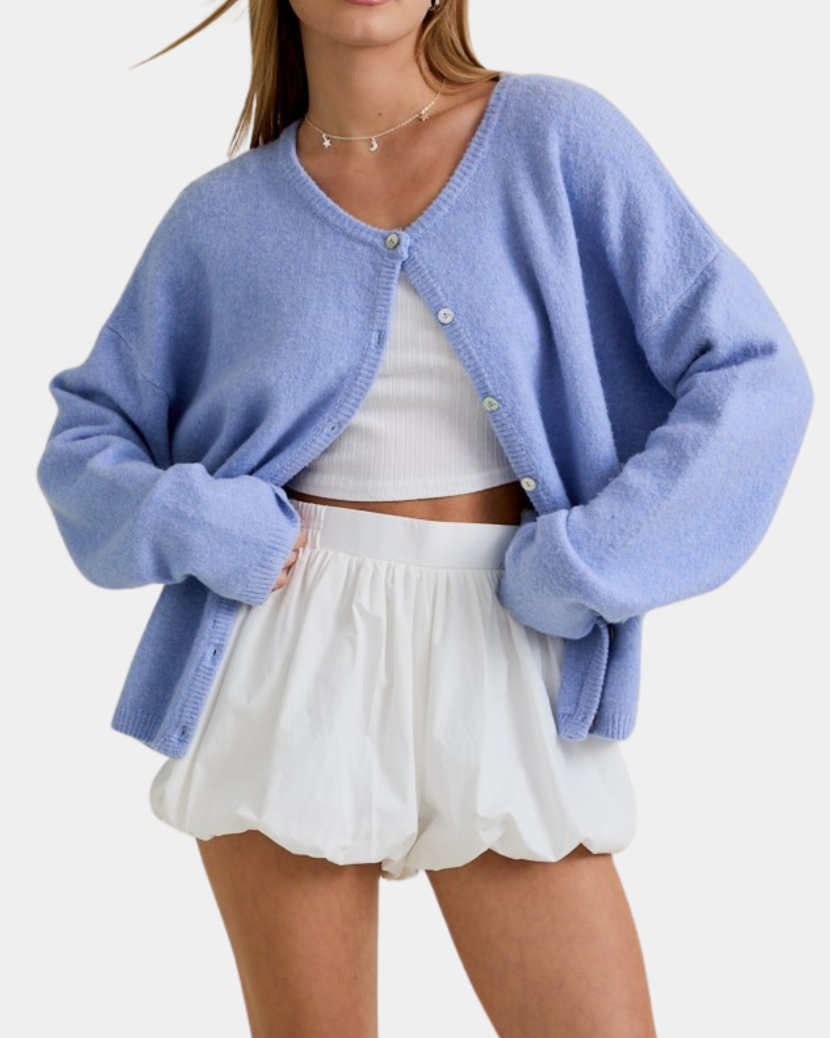 Layer up with this breezy light blue cardigan! Featuring classic button-down styling, it's your go-to piece for effortless cool. Throw it over anything for instant polish and comfort that works from morning coffee to evening plans.