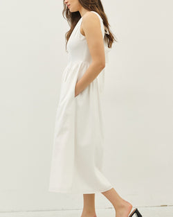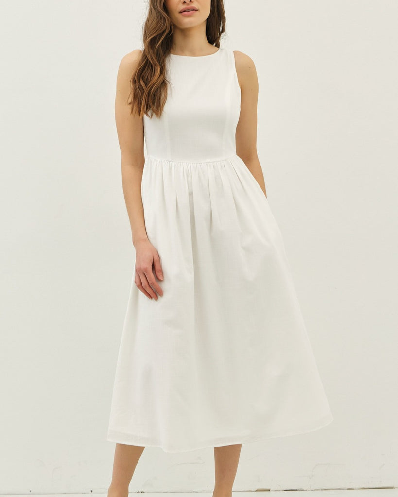 This dress is perfect for those sunny days and hot summer nights! With a sleeveless design and a flattering off-white color, you'll feel cool and stylish all day long. Its lightweight fabric will keep you comfortable and its versatile design makes it easy to dress up or down. Embrace the summer in style with this sleeveless off-white dress!