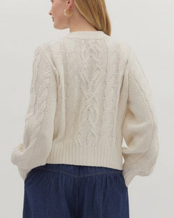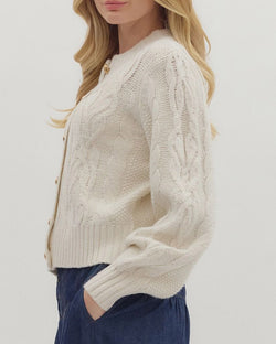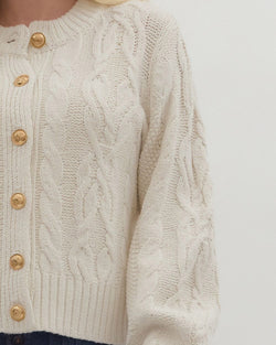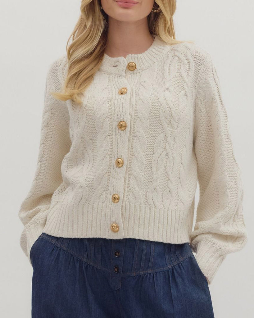 This soft cable knit cardigan features long sleeves and gold accent button closure. The perfect layering piece for the season. Leave it buttoned and wear as a top or leave it open and layer over dresses or t-shirts.