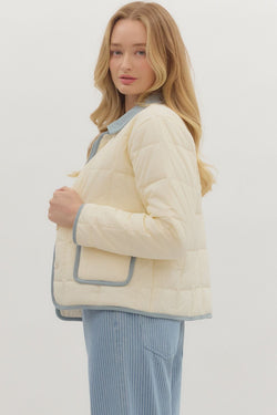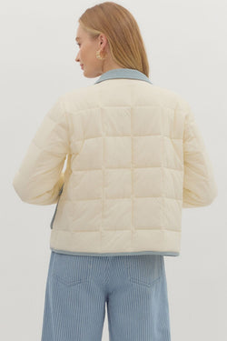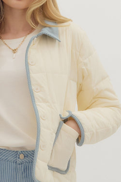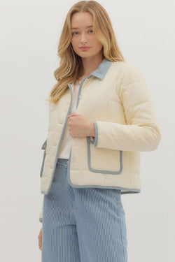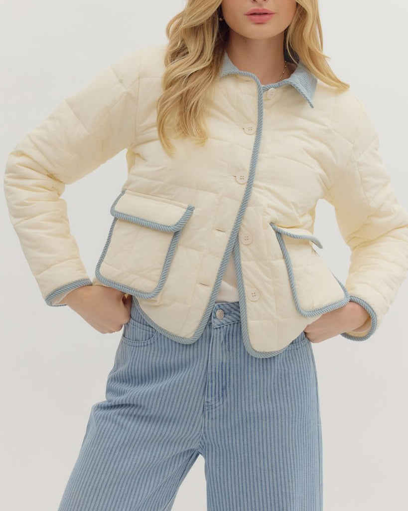 Stay cozy and stylish this fall with our Puffer Jacket featuring a soft cream hue and distinctive blue corduroy collar accents. Designed with convenient button closures and practical flap pockets at the front, this jacket blends warmth with everyday functionality. Perfect for crisp autumn days, it offers a comfortable fit that complements any casual look while keeping you comfortably insulated. Elevate your seasonal wardrobe with this versatile and eye-catching piece.