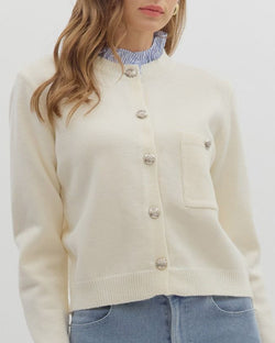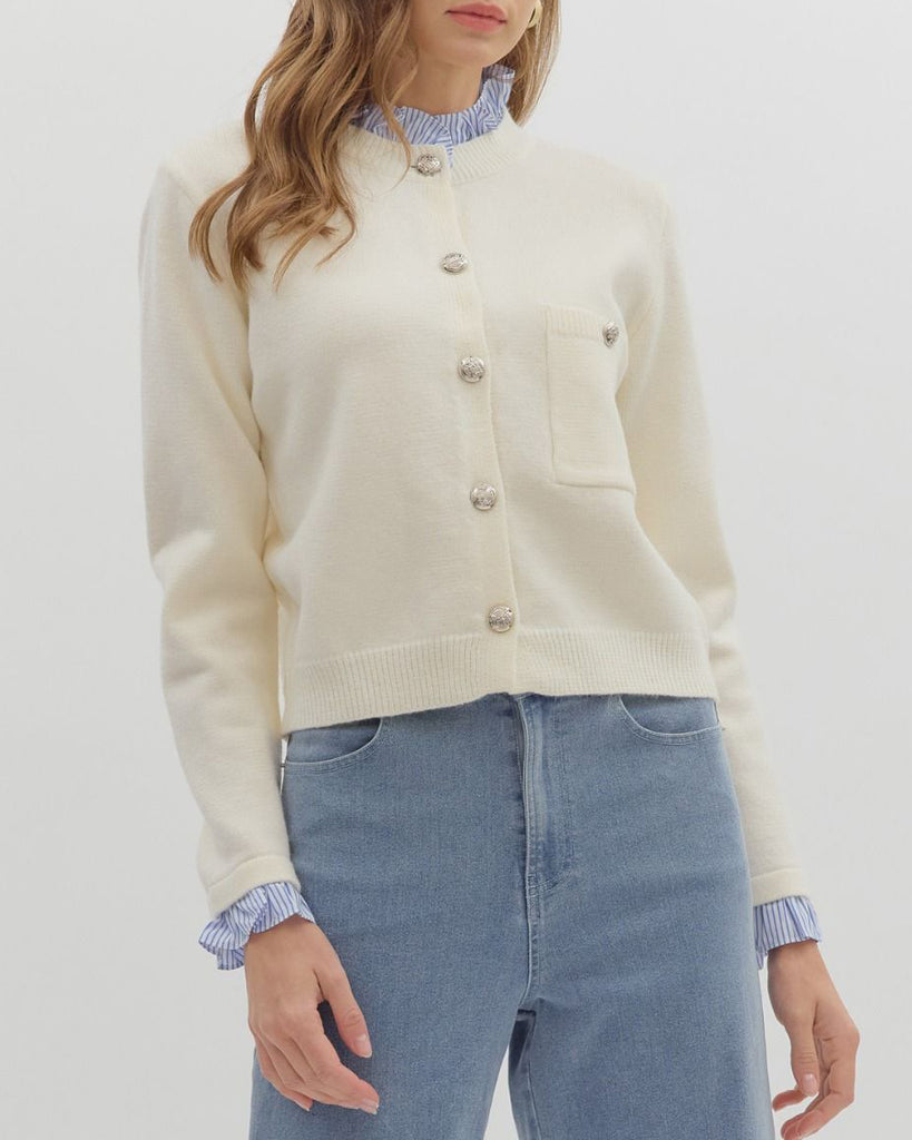 This darling button front cardigan features a soft knit fabrication, long sleeves, and striped contrast ruffle details at sleeve and neck. A must have for work or play.