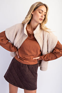 Elevate your fall wardrobe with the Oversized Moto Sherpa Vest in Ivory. Crafted from plush micro sherpa fabric, this vest offers exceptional warmth and a cozy feel. Its relaxed fit and funnel neck create a sophisticated silhouette, while the snap button front closure and pockets add functionality. Perfect as a layering piece, it effortlessly combines comfort with style for cooler days.