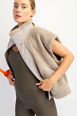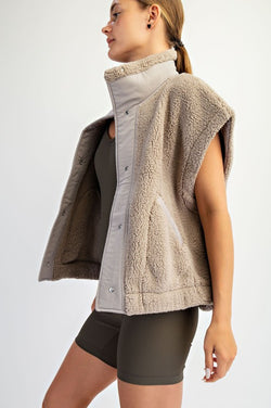 Elevate your fall wardrobe with the Oversized Moto Sherpa Vest in Stone Taupe. Crafted from plush micro sherpa fabric, this vest offers exceptional warmth and a cozy feel. Its relaxed fit and funnel neck create a sophisticated silhouette, while the snap button front closure and pockets add functionality. Perfect as a layering piece, it effortlessly combines comfort with style for cooler days.