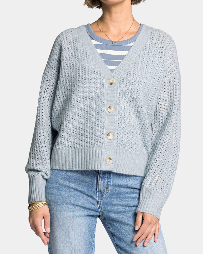 Wrap yourself in cozy charm with the Amour Cardigan in Pacific Blue. This effortless layer brings warmth and style to any outfit, whether you're lounging at home or stepping out for the day.