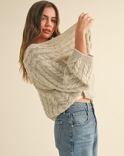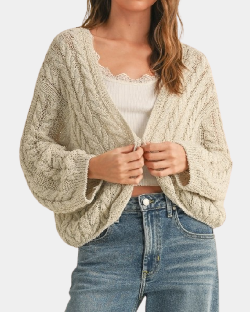 Wrap yourself in cozy charm with this Cable Knit Cardigan in Stone—perfect for chilly days and casual adventures alike. Soft, stylish, and ready to be your new favorite layer!