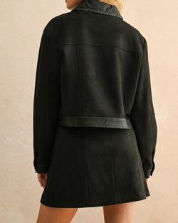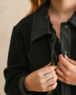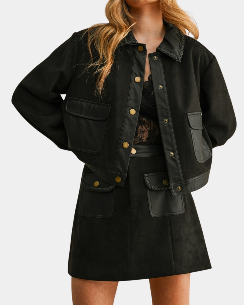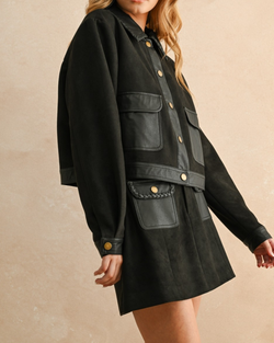Elevate your style with this black suede and leather jacket featuring playful pleated details and bold contrasting buttons.
