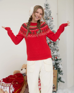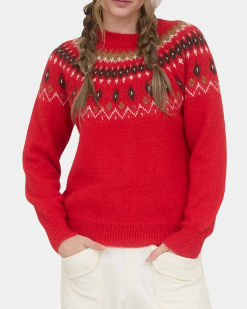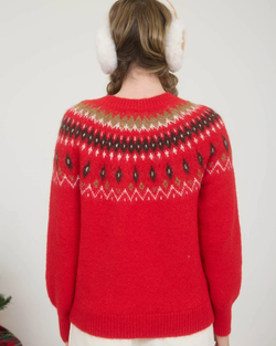 Snuggle into this fuzzy Fair Isle pullover with its cheerful red multi pattern. A playful crew neck sweater that's soft, cozy, and endlessly charming.
