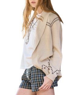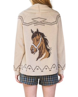 The Horse Jacquard Shawl Knit Cardigan in Ivory features a horse design on the back, adding a playful pop to your cozy look. Wrap yourself in its soft knit and shawl collar for comfort with a fun, equestrian flair.