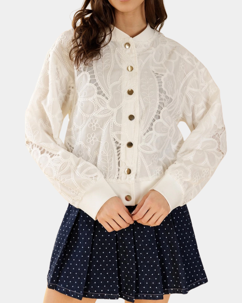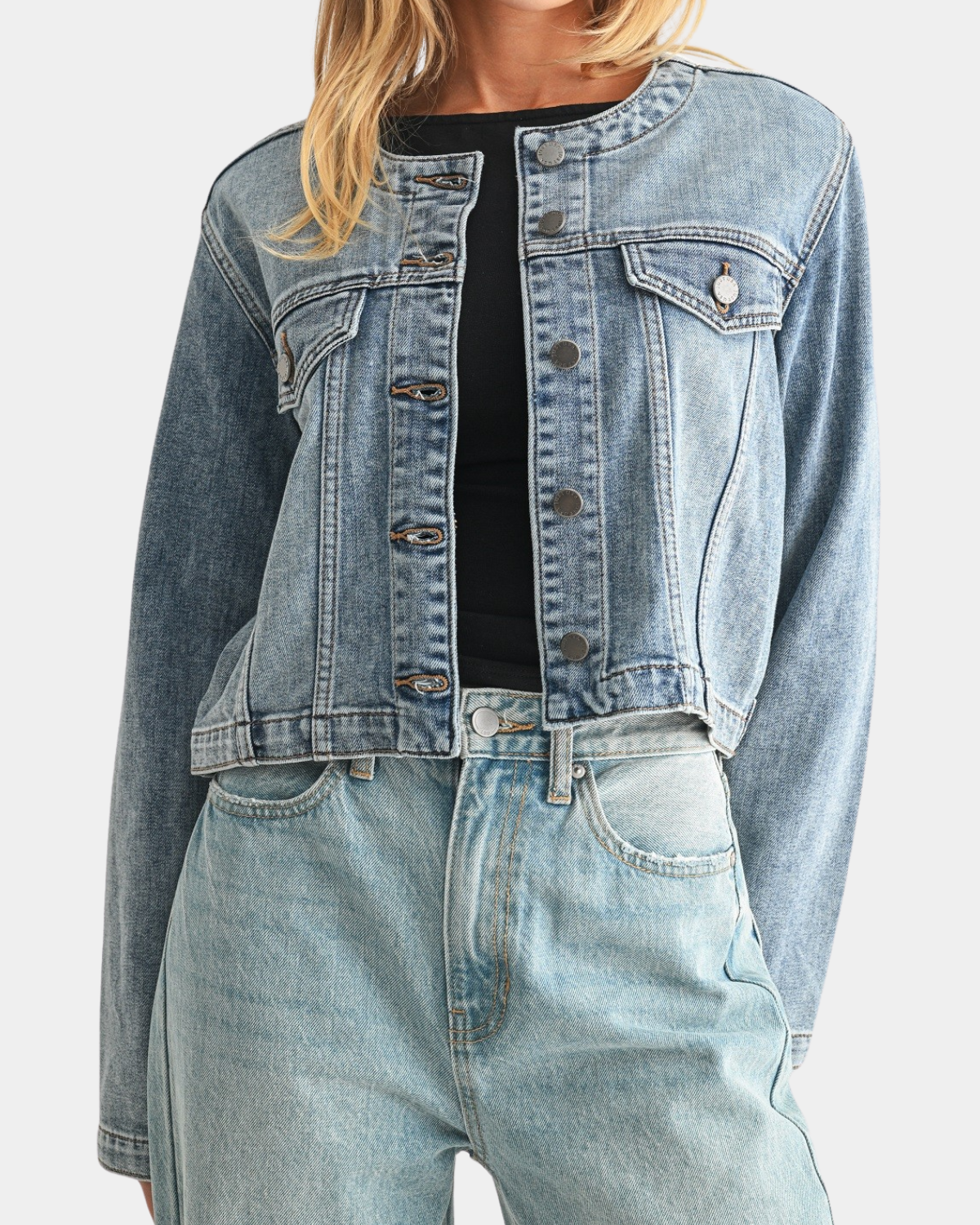 A collarless silhouette delivers refined minimalism with practical versatility. The medium wash denim transitions seamlessly across seasons, while the streamlined design excels as a layering piece.