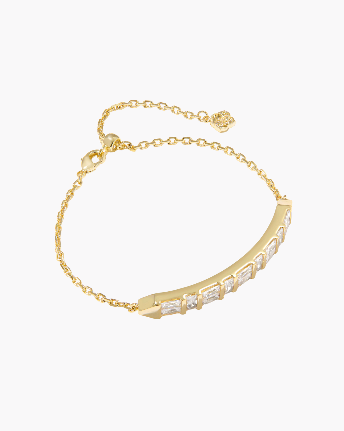 The Kendra Scott Jamie Bracelet combines polished gold-plated metal with bezel-set white cubic zirconia baguettes for refined sophistication. This delicate chain design transitions effortlessly from casual to formal, making it an essential addition to any jewelry wardrobe.