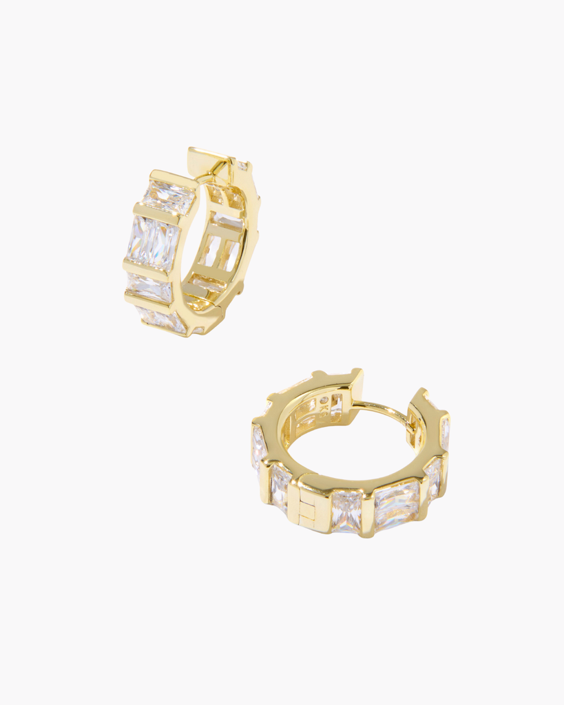 The Jamie Earrings feature bezel-set baguette crystals and polished metal for timeless elegance. These versatile huggie earrings work beautifully for any occasion, whether styled casually or dressed up.