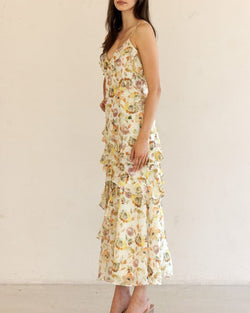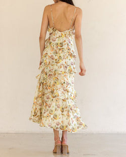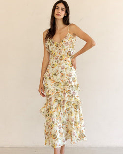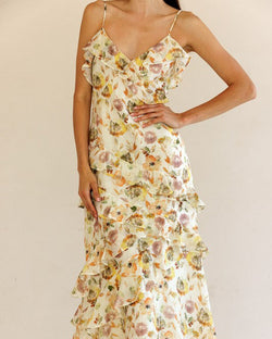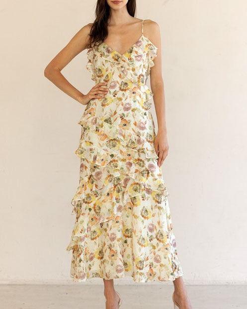 This gorgeous floral print maxi dress features tiered ruffles that cascade down the dress, a v-neckline with ruffle details and a lightweight fabric that is easy to dress up or down.