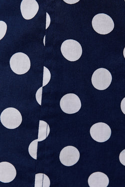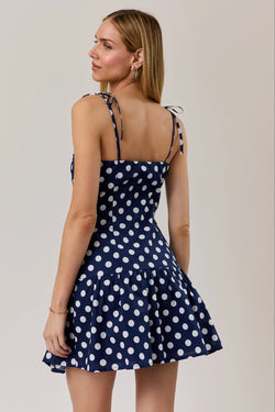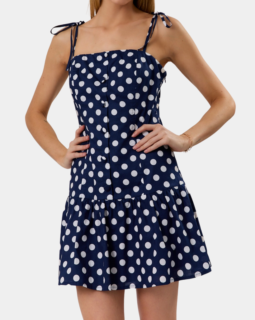 Cute polka dot mini with a playful drop waist—perfect for twirling into your next adventure. Navy and white combo that's equal parts sweet and sassy.