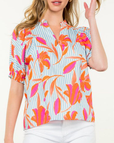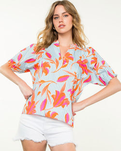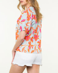 This adorable top features a flower and stripe print, a v-neckline and short sleeves with elastic on the ends. A summer staple to style with everything from jeans to shorts to pants.