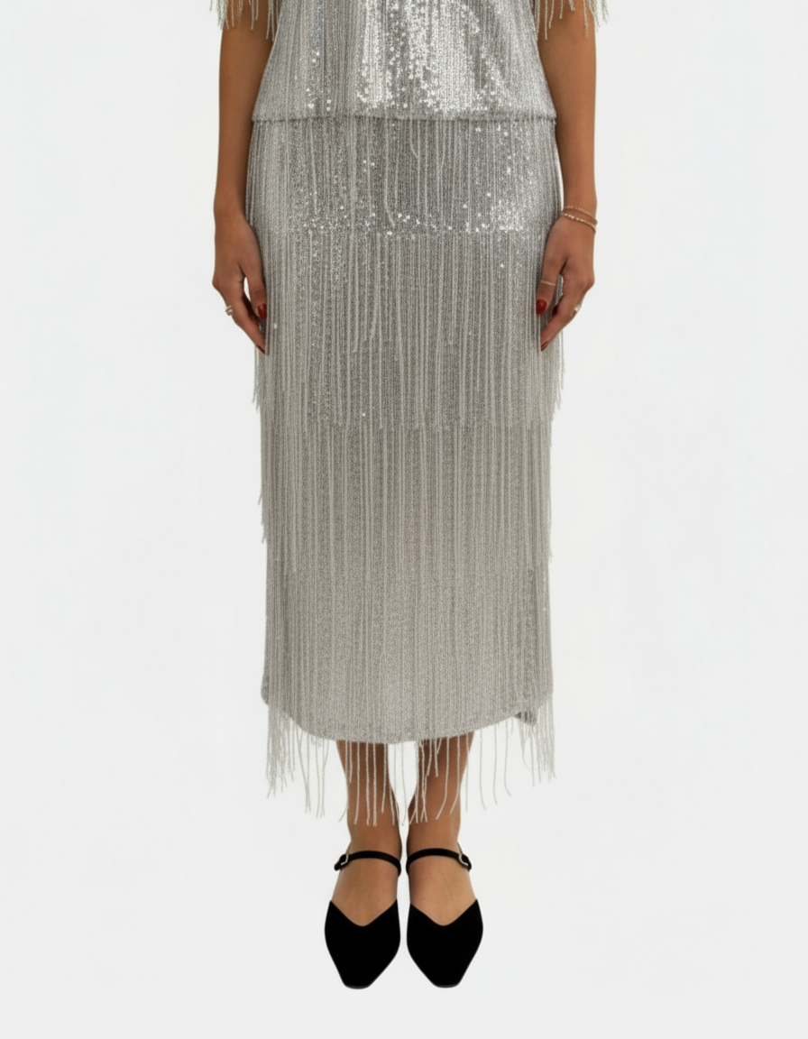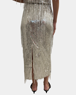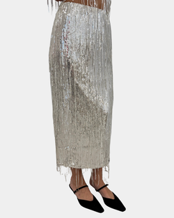 Shine bright in this Silver Sequin Midi Skirt that catches every eye with its dazzling sparkle. Pair it with the matching sequin top for a show-stopping, head-to-toe glitter look that's perfect for dancing the night away!