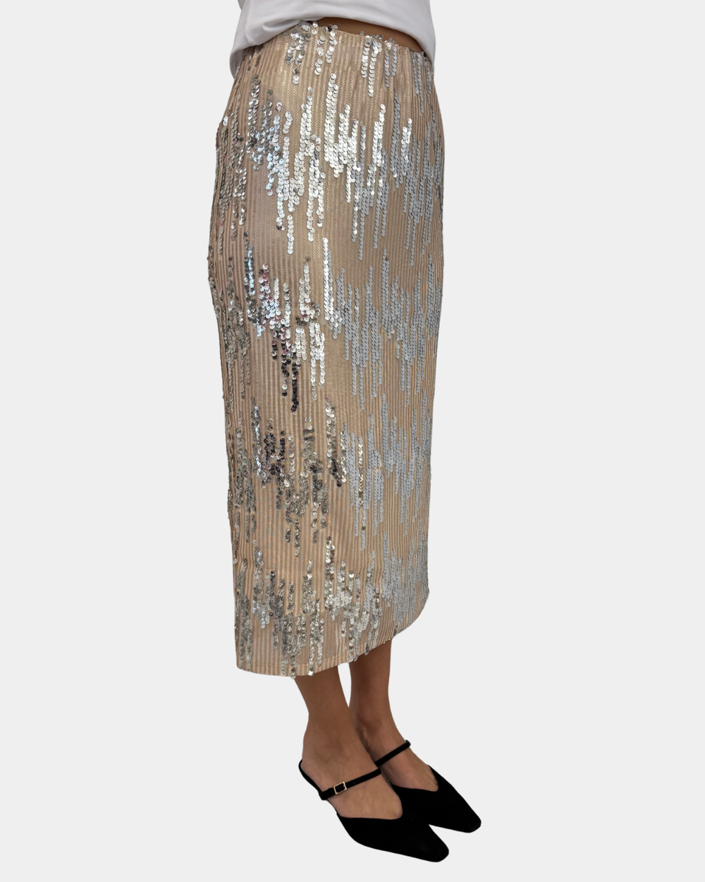 Shine bright in this beige sequin midi skirt that adds sparkle to every step. Perfect for dancing the night away or making any day feel like a celebration!