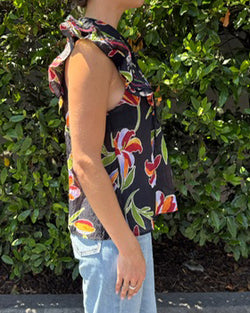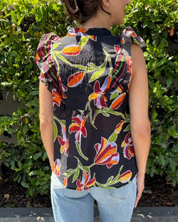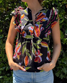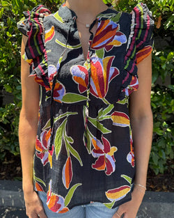 This bold floral print top features a v-neckline and short flutter sleeves. Comfy and chic, this style is a must for casual days and beyond.