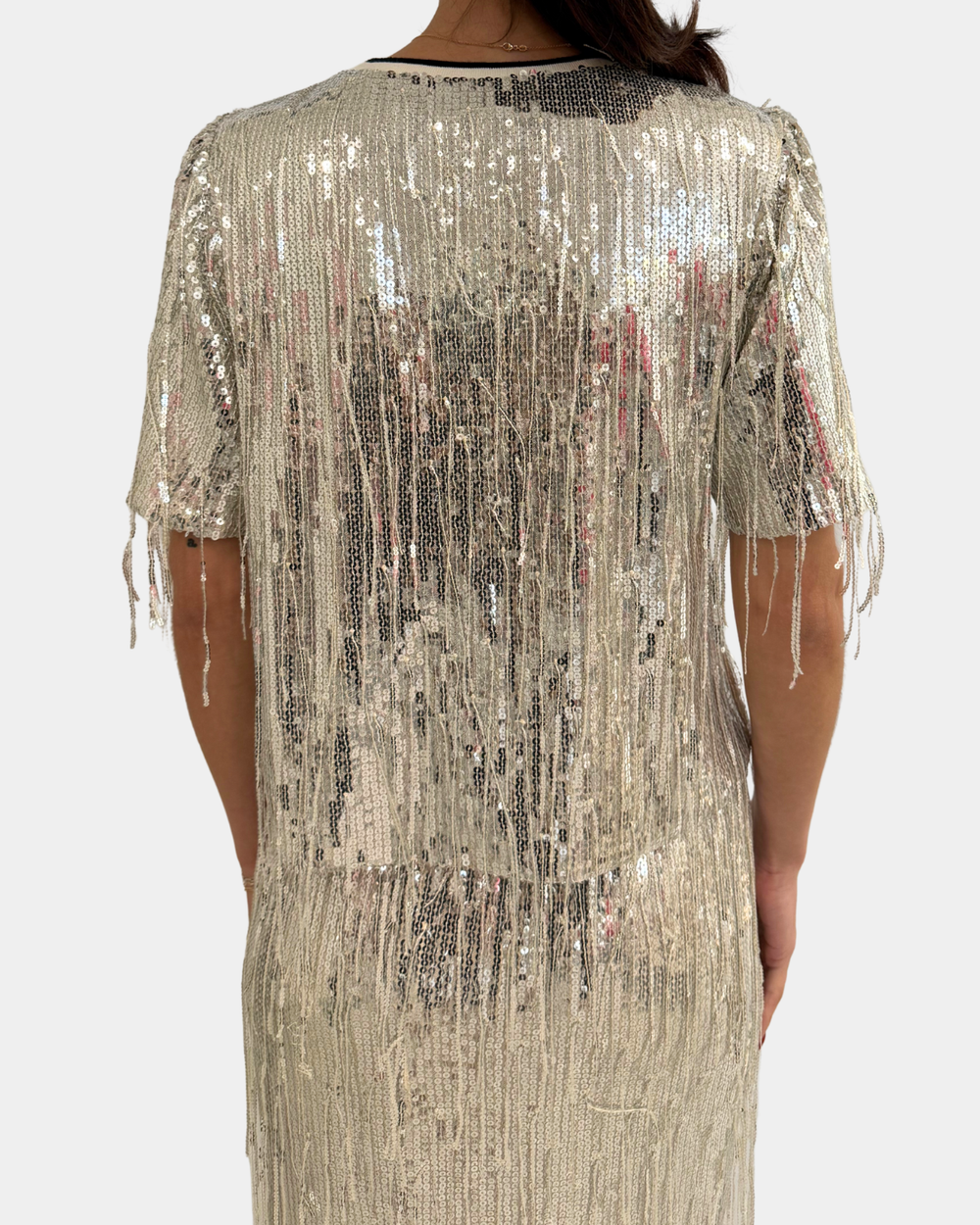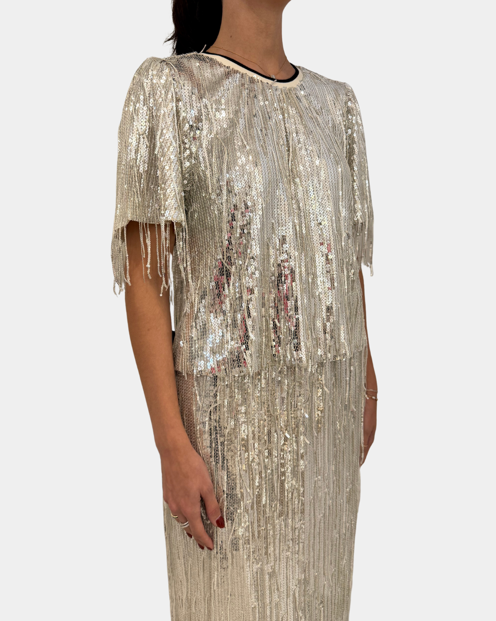 Shine bright in the beige Sequin Fringe Top that twinkles with every step. Pair it with its matching skirt for a dazzling duo that’s party-ready from head to toe!
