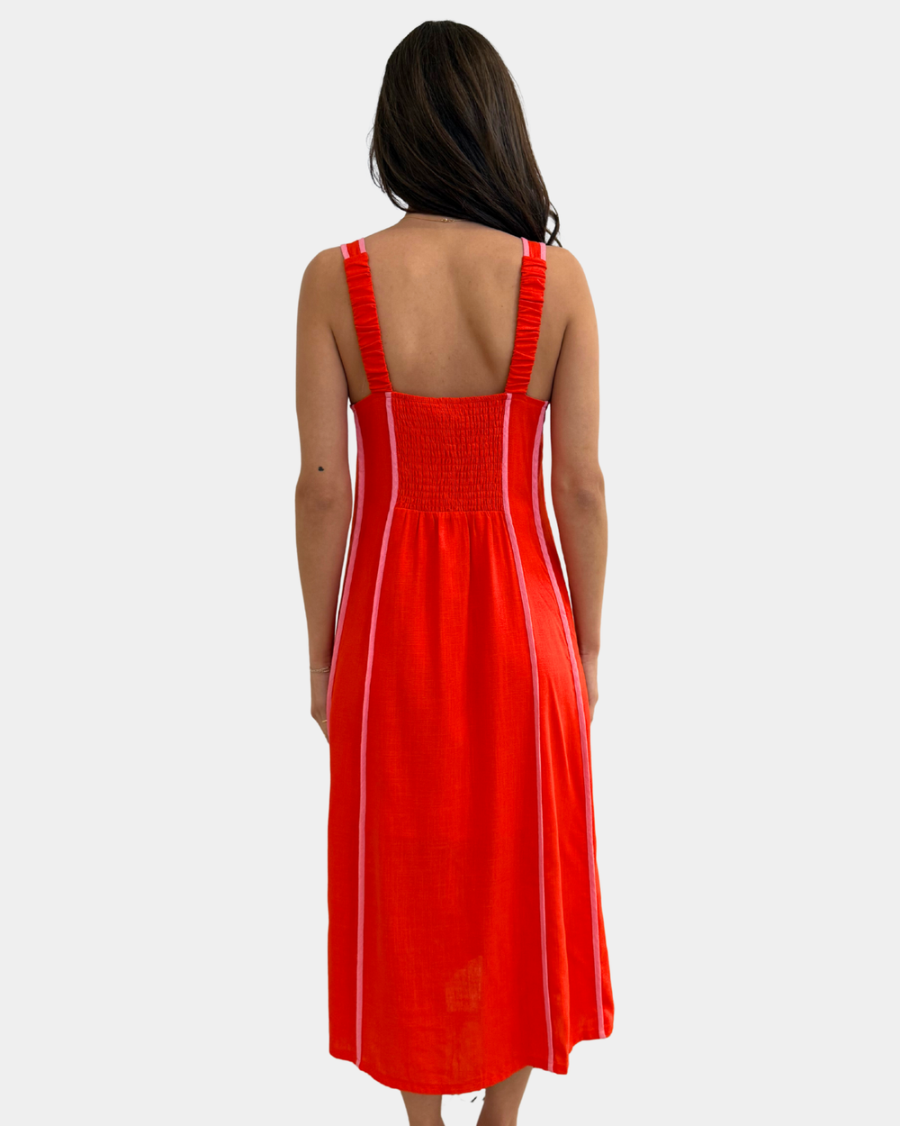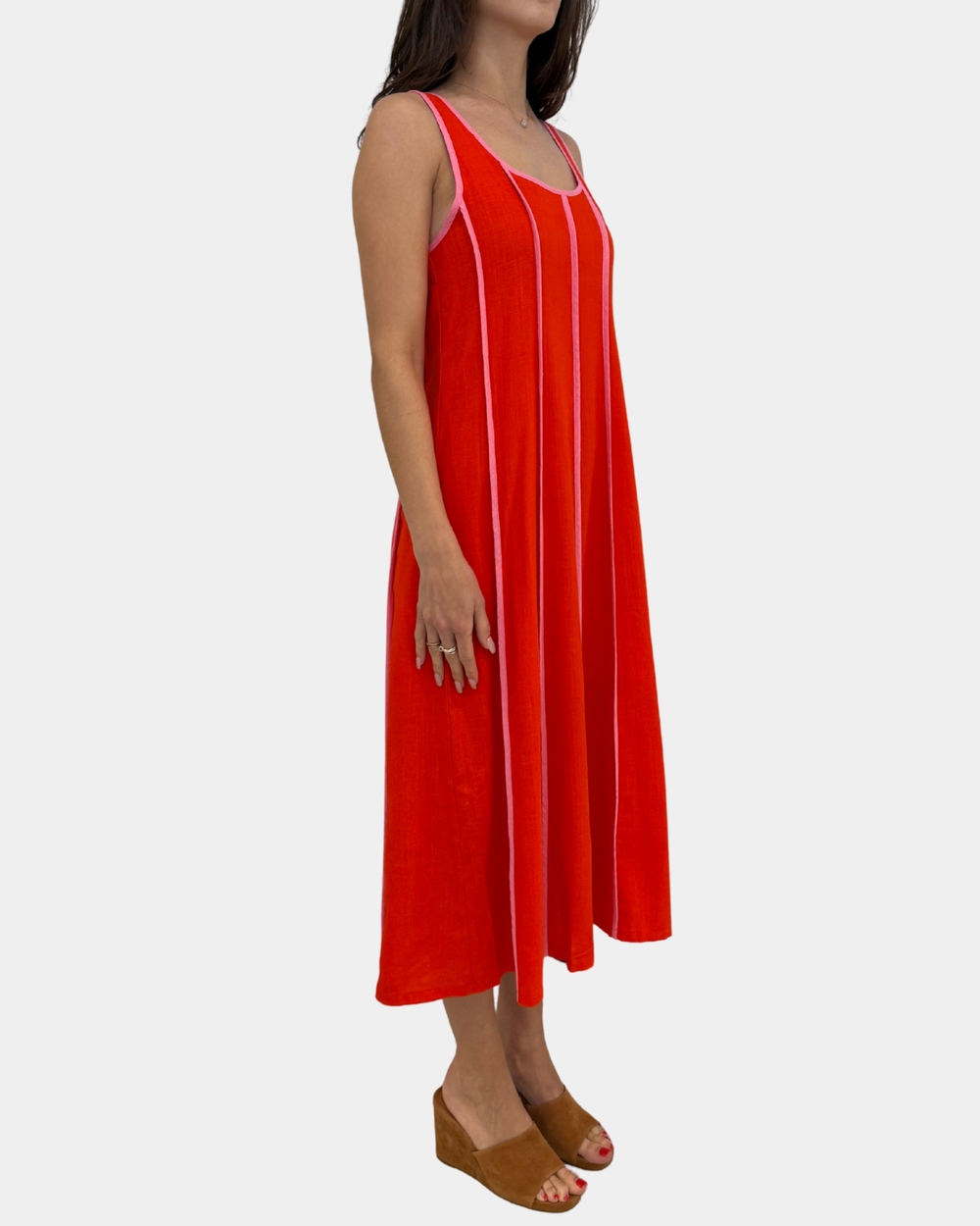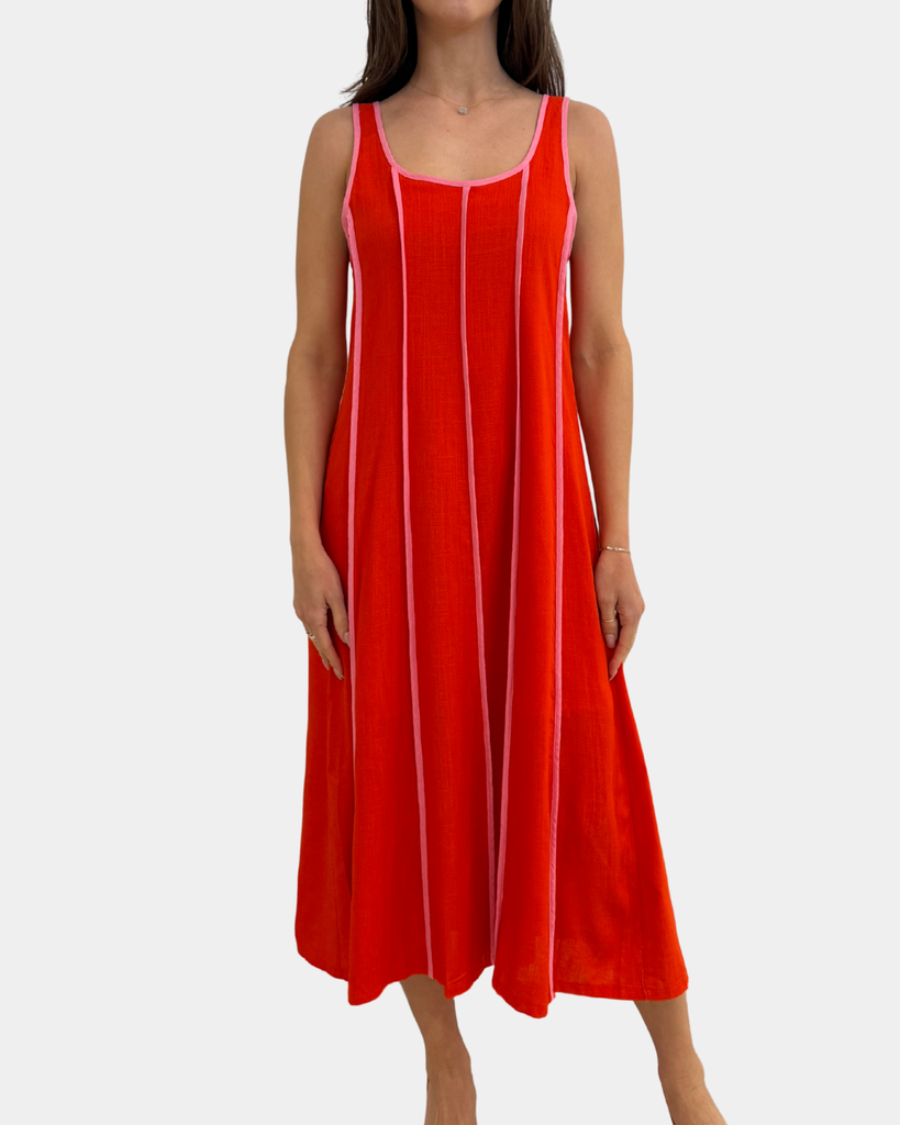 Make a bold statement in this eye-catching vertical stripe dress that pairs rich red with vibrant pink for maximum impact. The contrasting stripes create a flattering, elongating effect while the playful color combo keeps things fun and flirty.