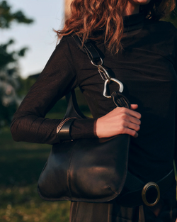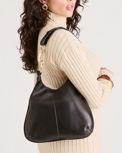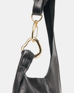 The JOHNNIE shoulder bag combines a streamlined, timeless design with an adjustable asymmetrical strap accented by contemporary mixed metals. Crafted in classic black leather or elegant burgundy suede, it provides ample space for all your daily essentials.