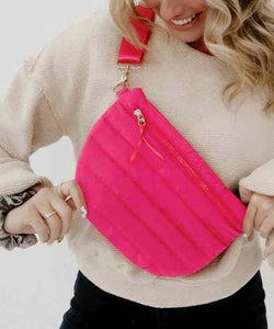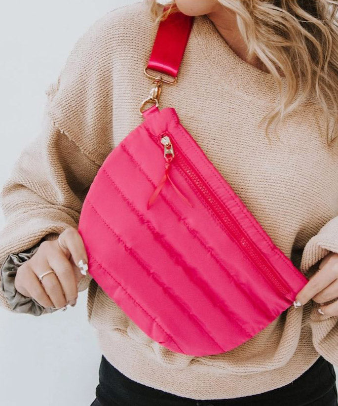 A trendy take on the updated fanny pack that can be worn in multiple ways. Wear it as a belt bag/fanny pack, crossbody, or shoulder bag. Features a fun half moon shape with a coordinating shiny canvas strap and gold hardware and a pop of color with ribbon accent.