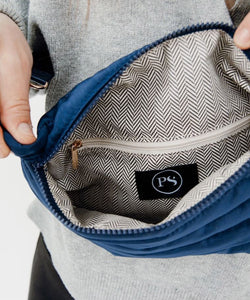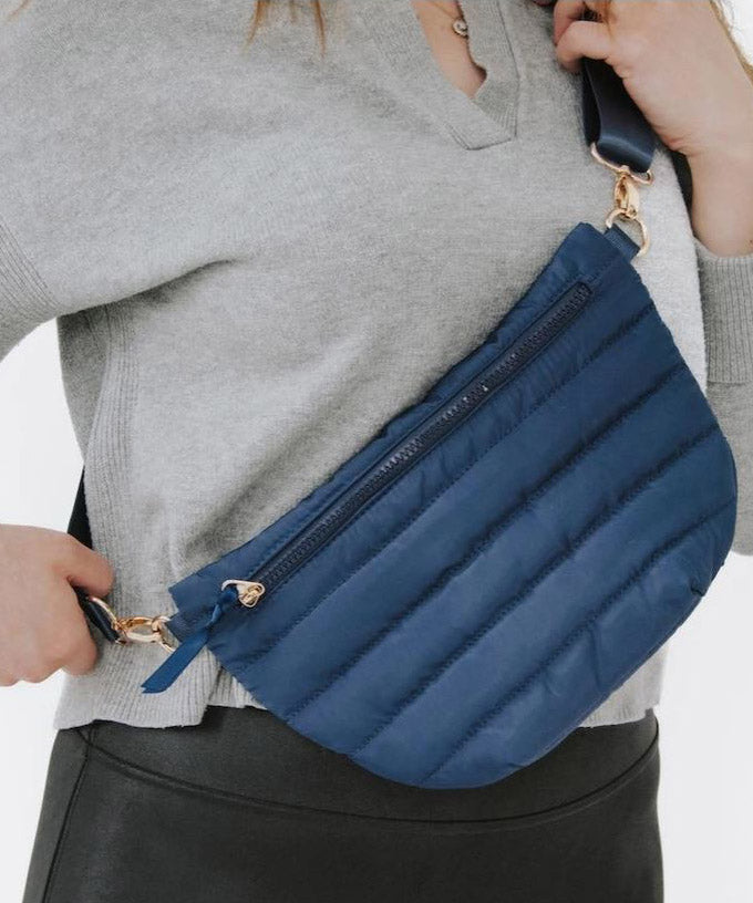 A trendy take on the updated fanny pack that can be worn in multiple ways. Wear it as a belt bag/fanny pack, crossbody, or shoulder bag. Features a fun half moon shape with a coordinating shiny canvas strap and gold hardware and a pop of color with ribbon accent.