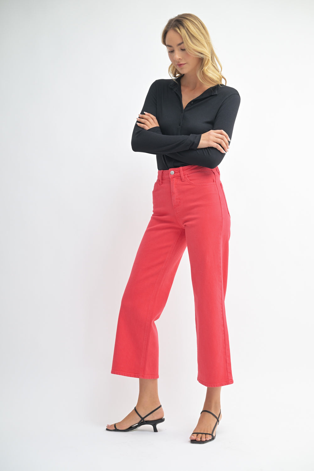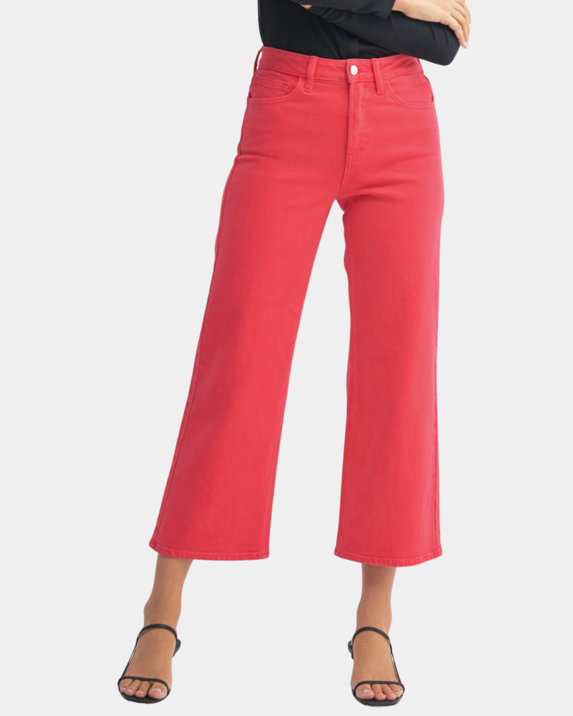 Bold red jeans with a sleek hip fit that opens into a fun wide-leg silhouette. The eye-catching crimson shade makes these the perfect go-to for turning heads and expressing your style with confidence.