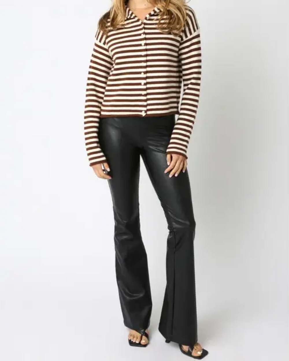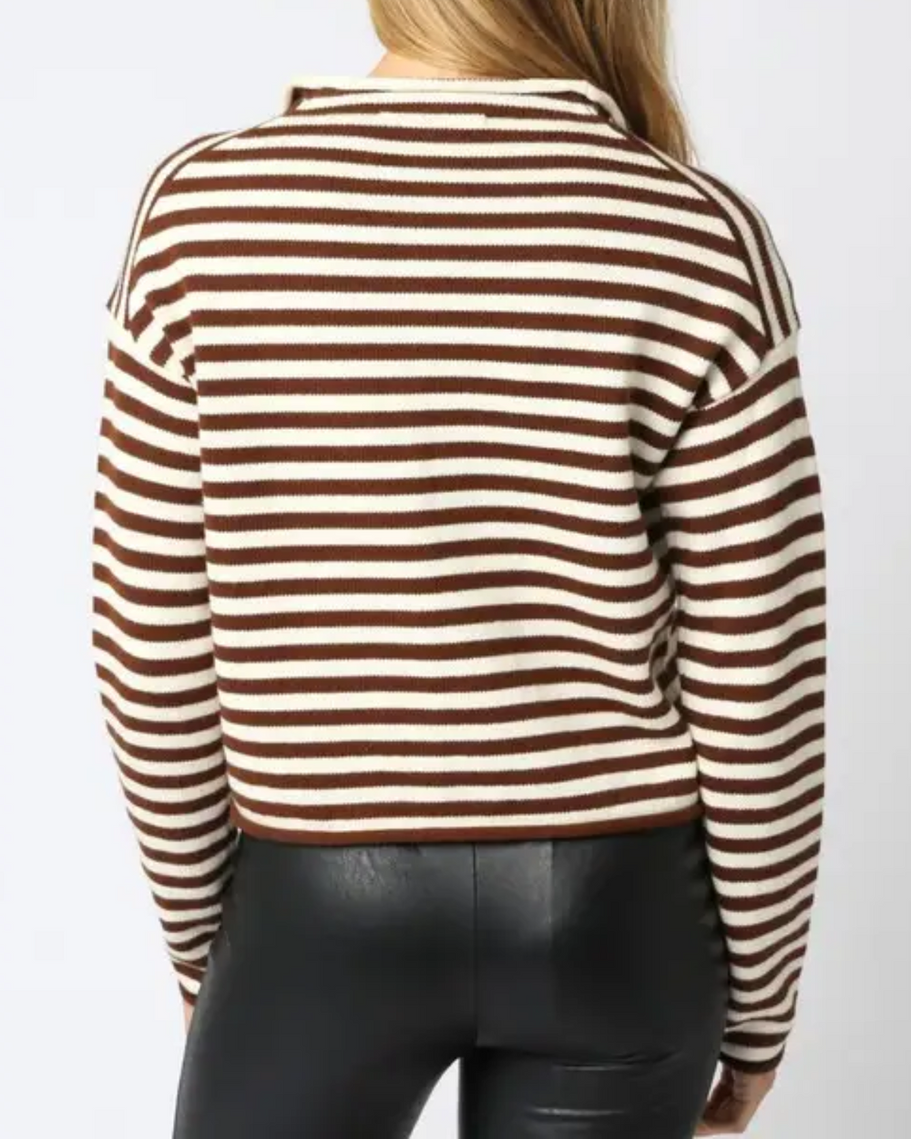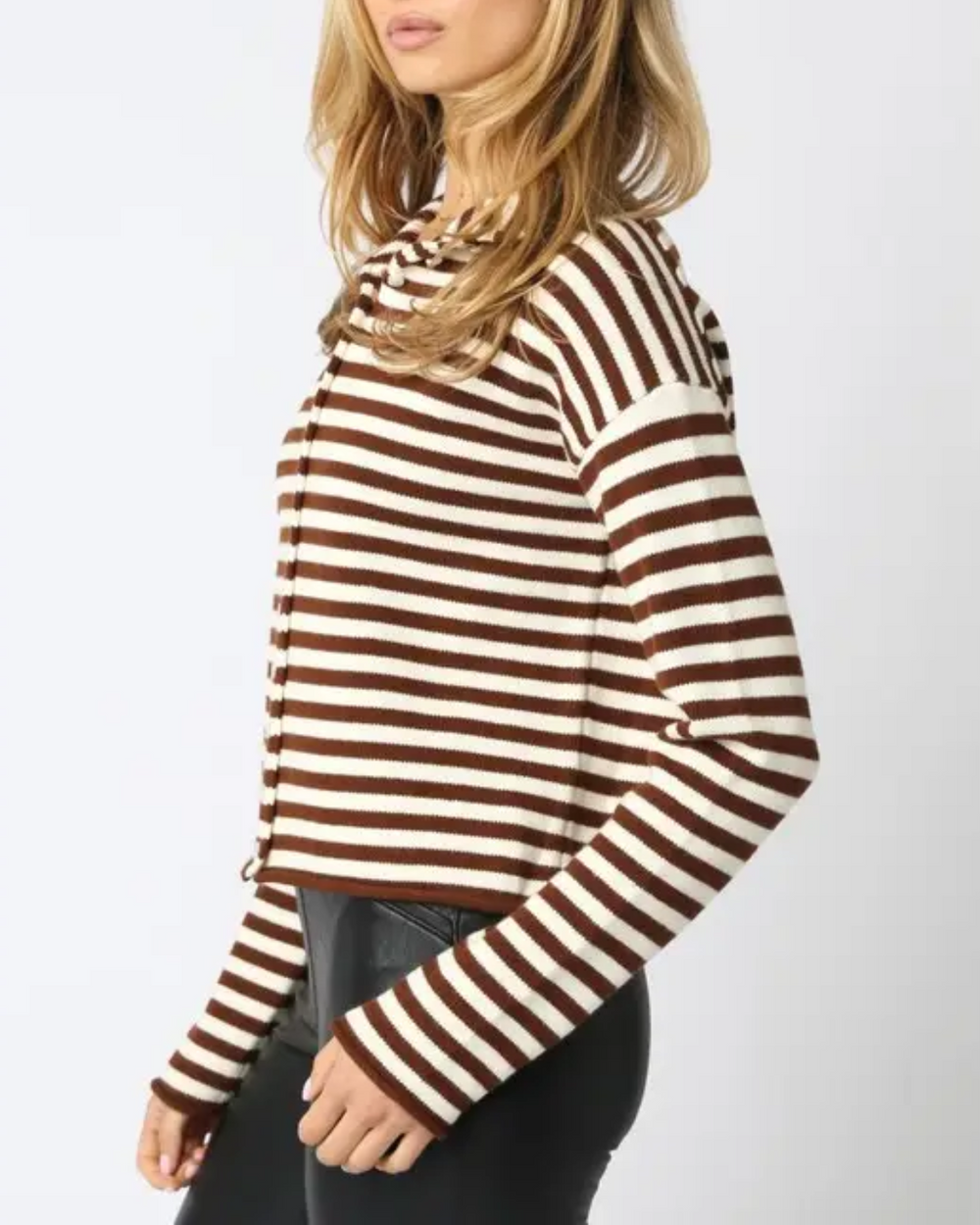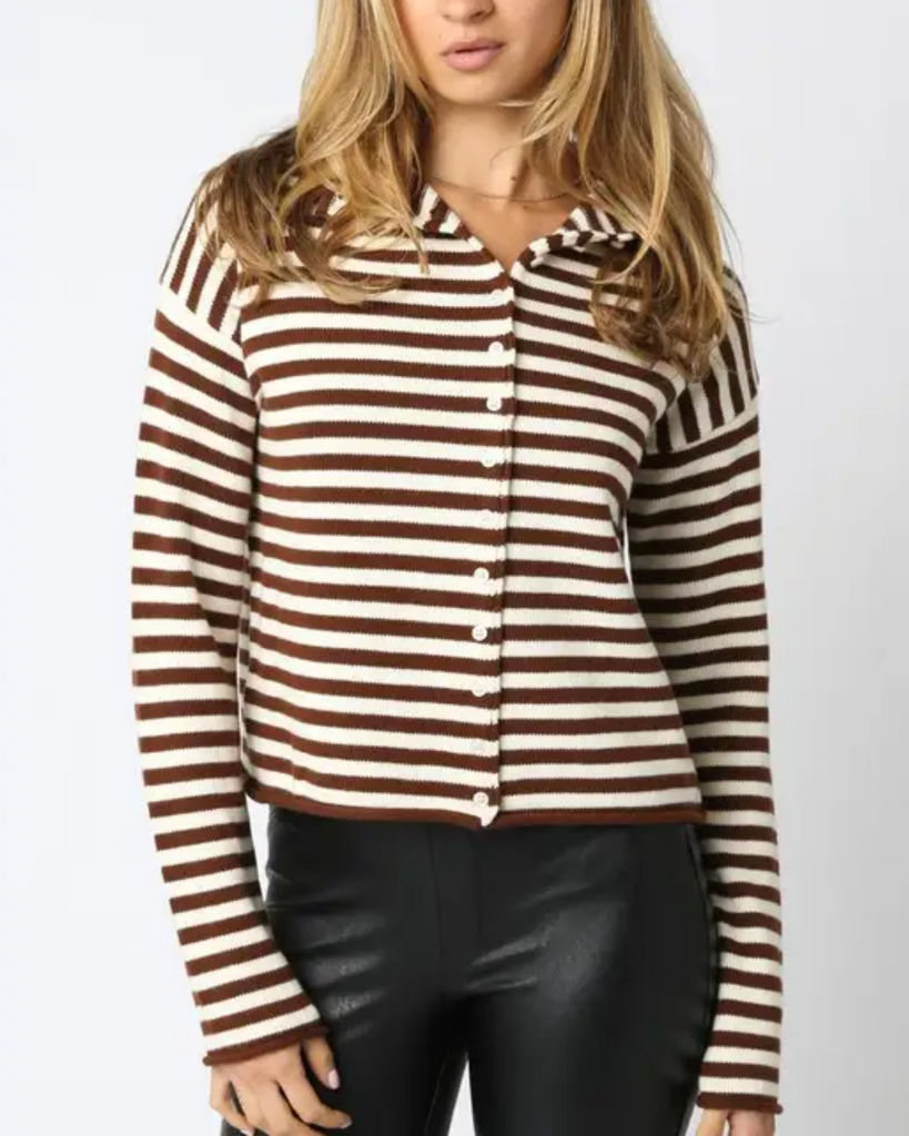 The Elina Stripe Top in Ivory and Brown blends cozy cashmere and cotton for a soft, snuggly feel with a fun striped twist. With its button-down front and long sleeves, it’s the perfect playful pick for any outfit.