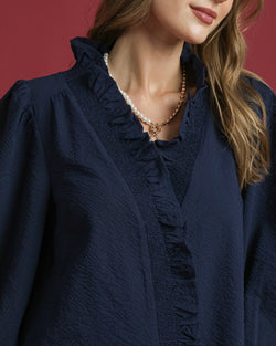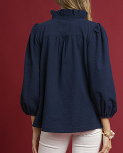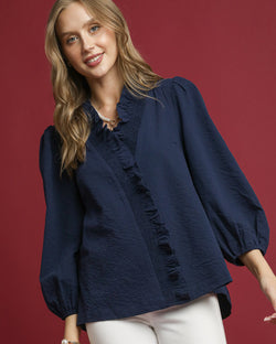 This textured blouse features three quarter sleeves, a spit v-neckline with ruffle trim and a straight hemline. A best seller that is flattering and easy to style for work or play.