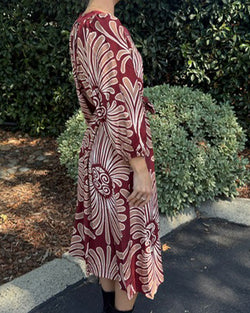 Elevate your fall wardrobe with this chic midi dress in a rich wine hue. Featuring a flattering v-neckline and a self-belted waist, it effortlessly enhances your silhouette while offering comfort and style. The elegant midi length and unique abstract pattern make it perfect for autumn occasions, blending timeless appeal with modern flair.