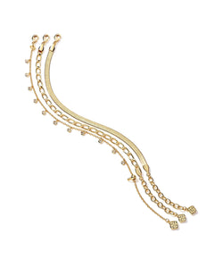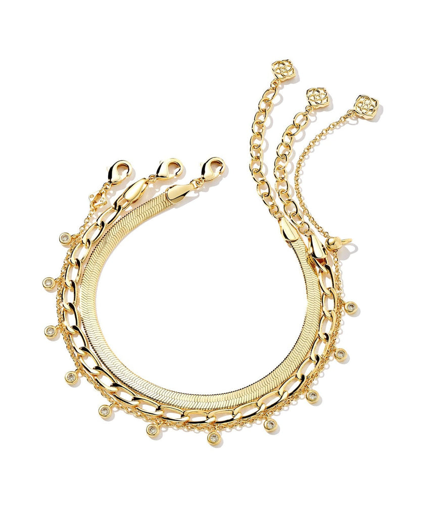 The Kassie Set of 3 Chain Bracelet in Gold features three classic chain links. Complete with a herringbone, paperclip, and crystal charm chain, wear altogether or curate your own bracelet stack.