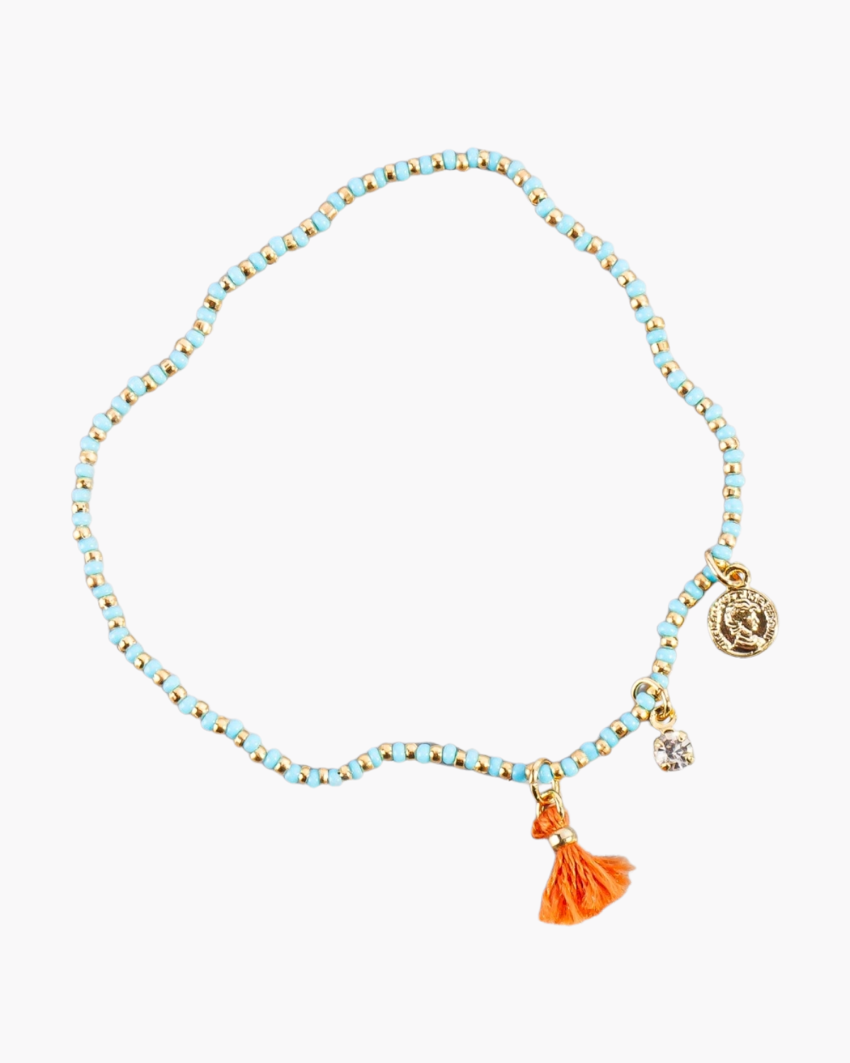 Playful turquoise beads meet timeless stretch comfort. This dainty bracelet with coin tassel charm adds just the right touch of personality to your everyday style.